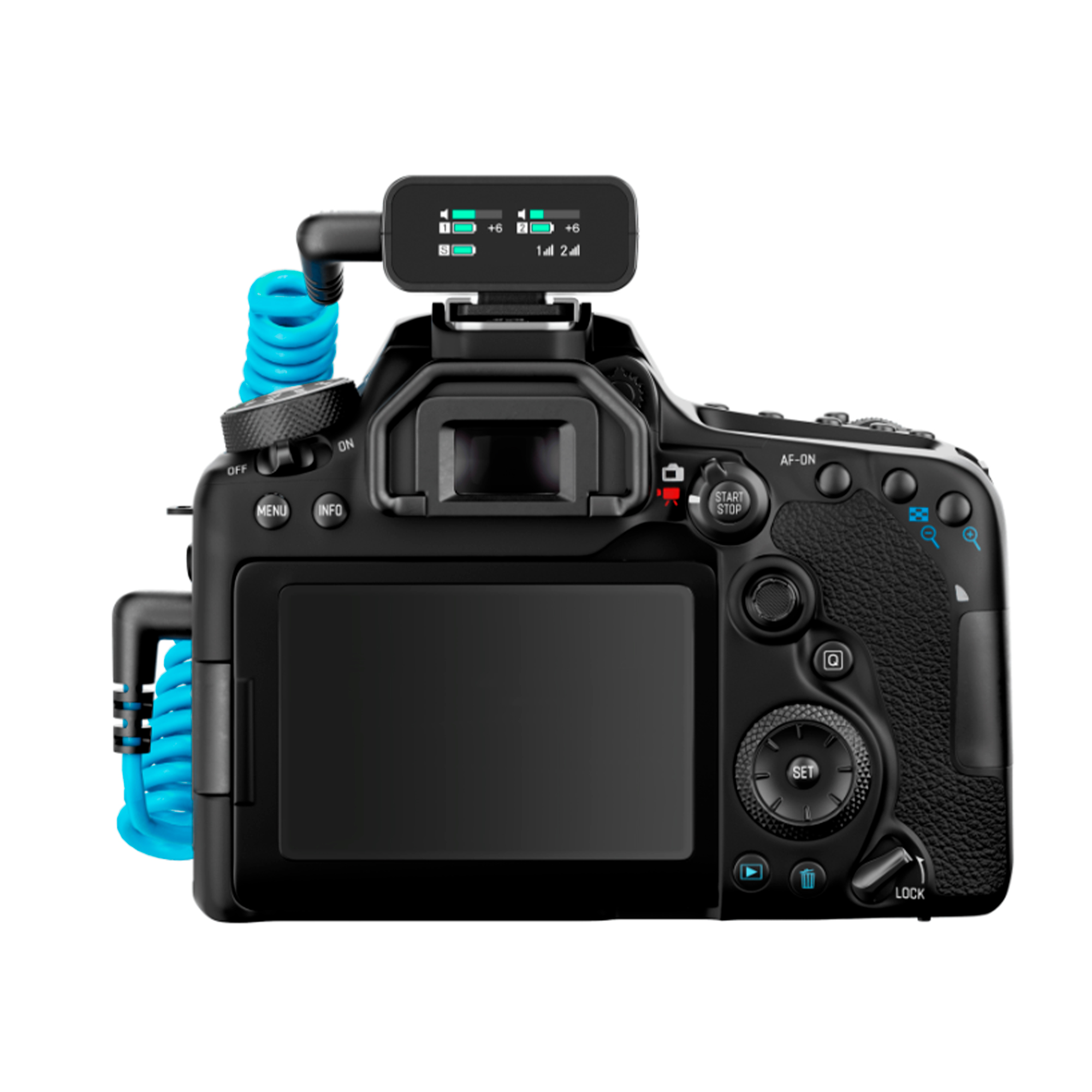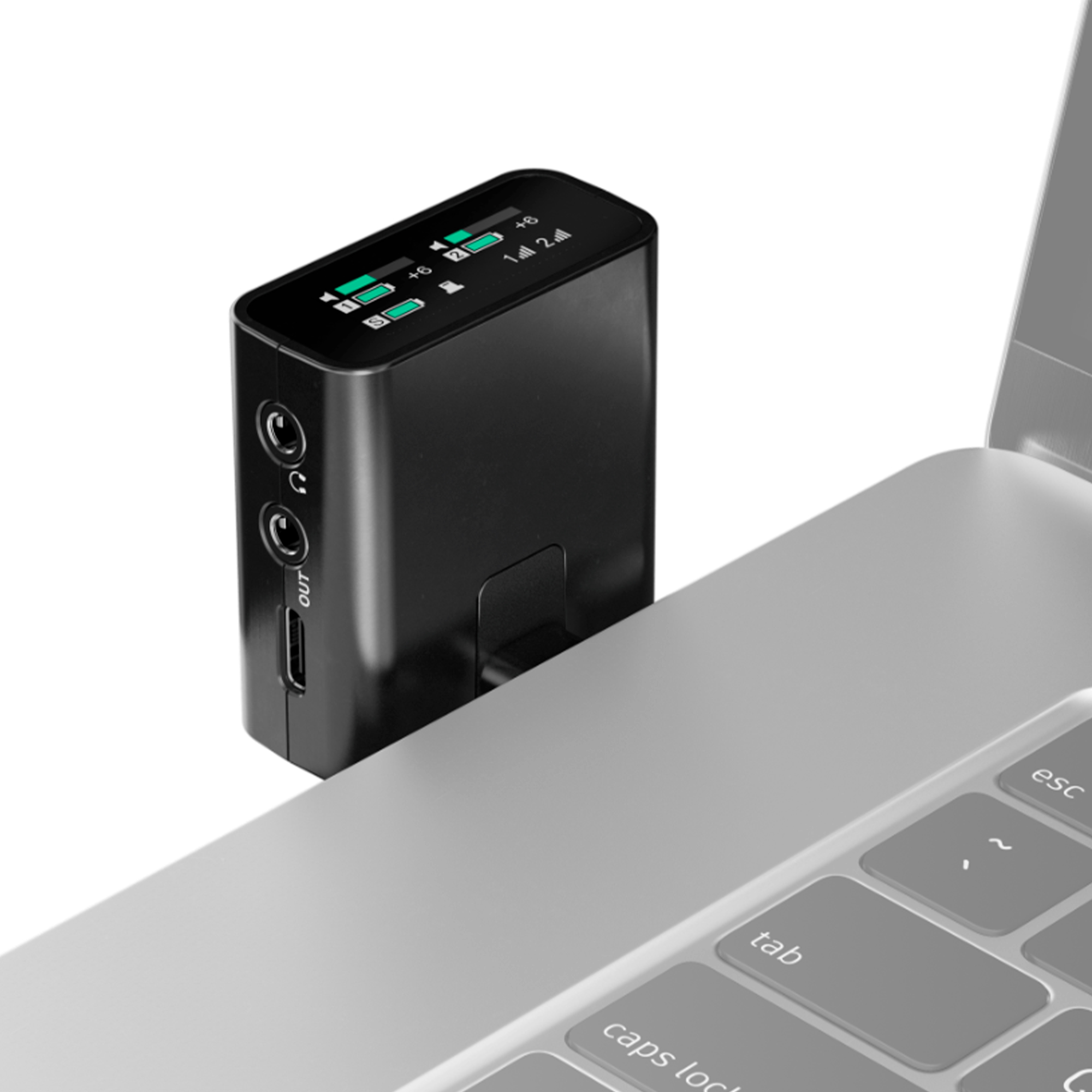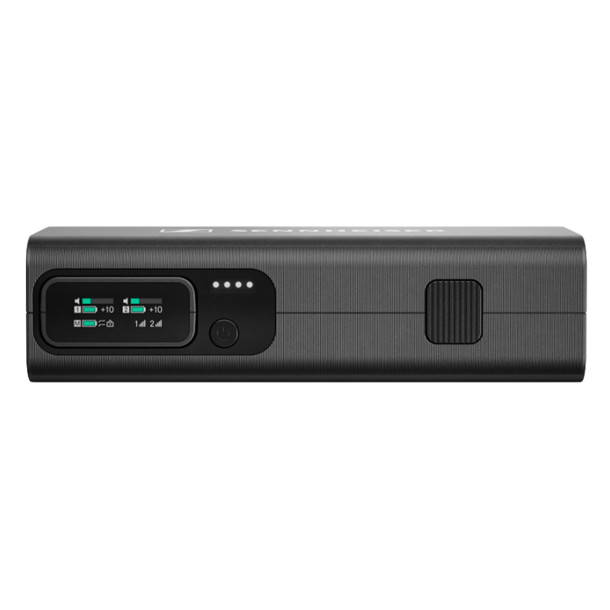 Эта зарядная панель оснащена двухканальным приемником с сенсорным OLED-дисплеем, двумя микрофонами-петличками, которые автоматически подключаются к приемнику, магнитными зажимами для крепления микрофонов к одежде и адаптерами для подключения приемника к мобильным телефонам или креплению «холодный башмак» камеры.