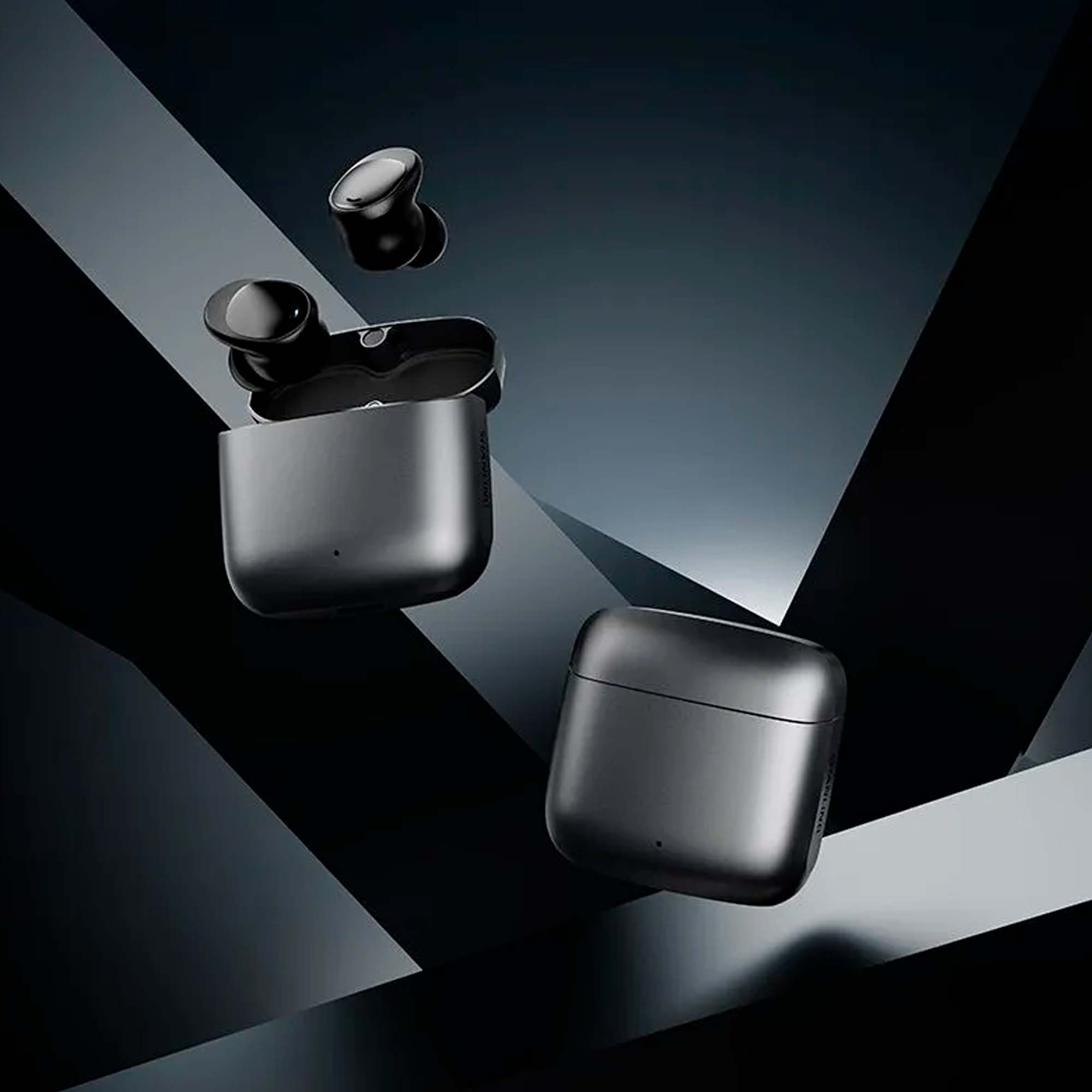 Стильный кейс для хранения и переноски изготовлен из цинк-алюминиевого сплава и устойчив к неблагоприятным воздействиям окружающей среды по стандарту IPX4, при том, что сами наушники сертифицированы по стандарту IPX7, а значит их можно использовать в любую погоду, а также при занятиях спортом.