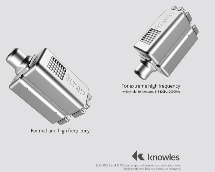 10-мм композитный динамический драйвер с высоким магнитным потоком а также, пара арматурных драйверов Knowles TWFK-30017 отвечающих за низко частотный и среднечастотный диапазоны и вторая пара Knowles TWFK-31736 контролирует только высокочастотный диапазон. Диафрагма создана полимерного состава с титановым напылением