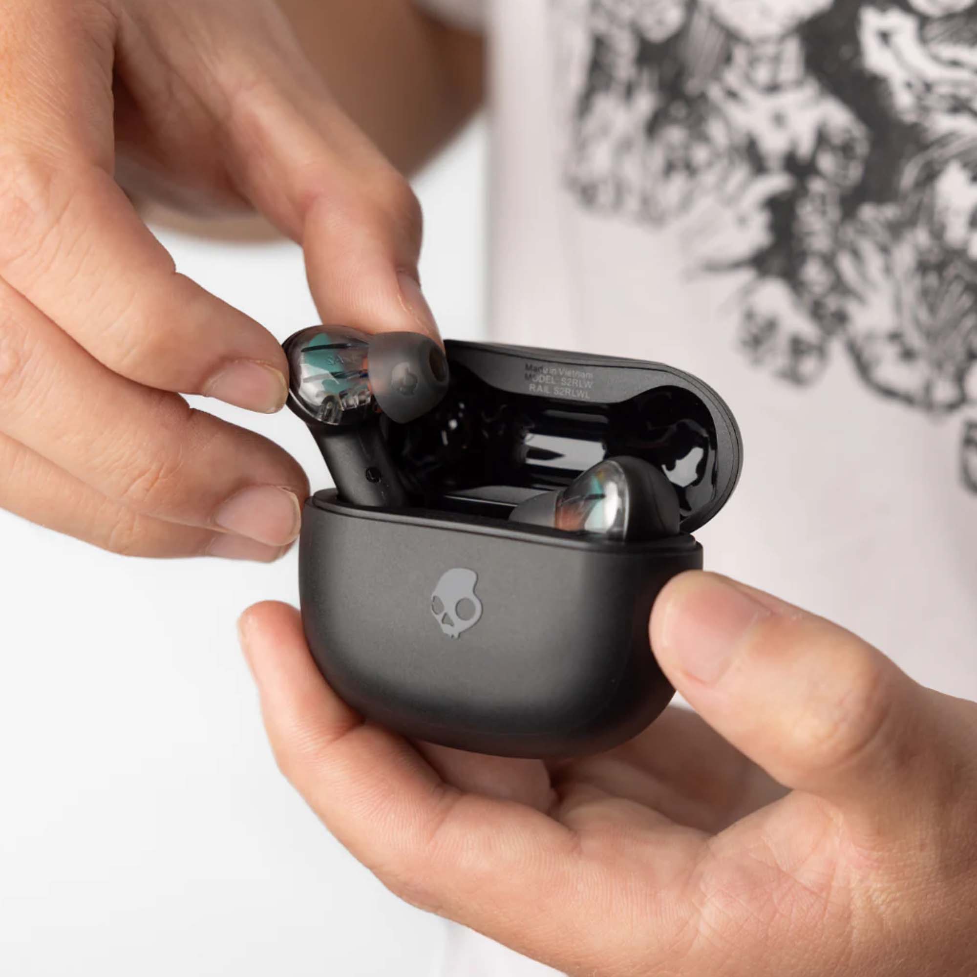 Беспроводные наушники Skullcandy Rail обеспечивают мощный, детализированный звук так как они оснащены высококачественными динамиками и эргономичными амбушюрами для удобной посадки в ушах, а для комфортного ношения в комплект входят 3 гелевых амбушюра разных размеров – это S, M и L, таким образом можно найти оптимальную посадку наушников.