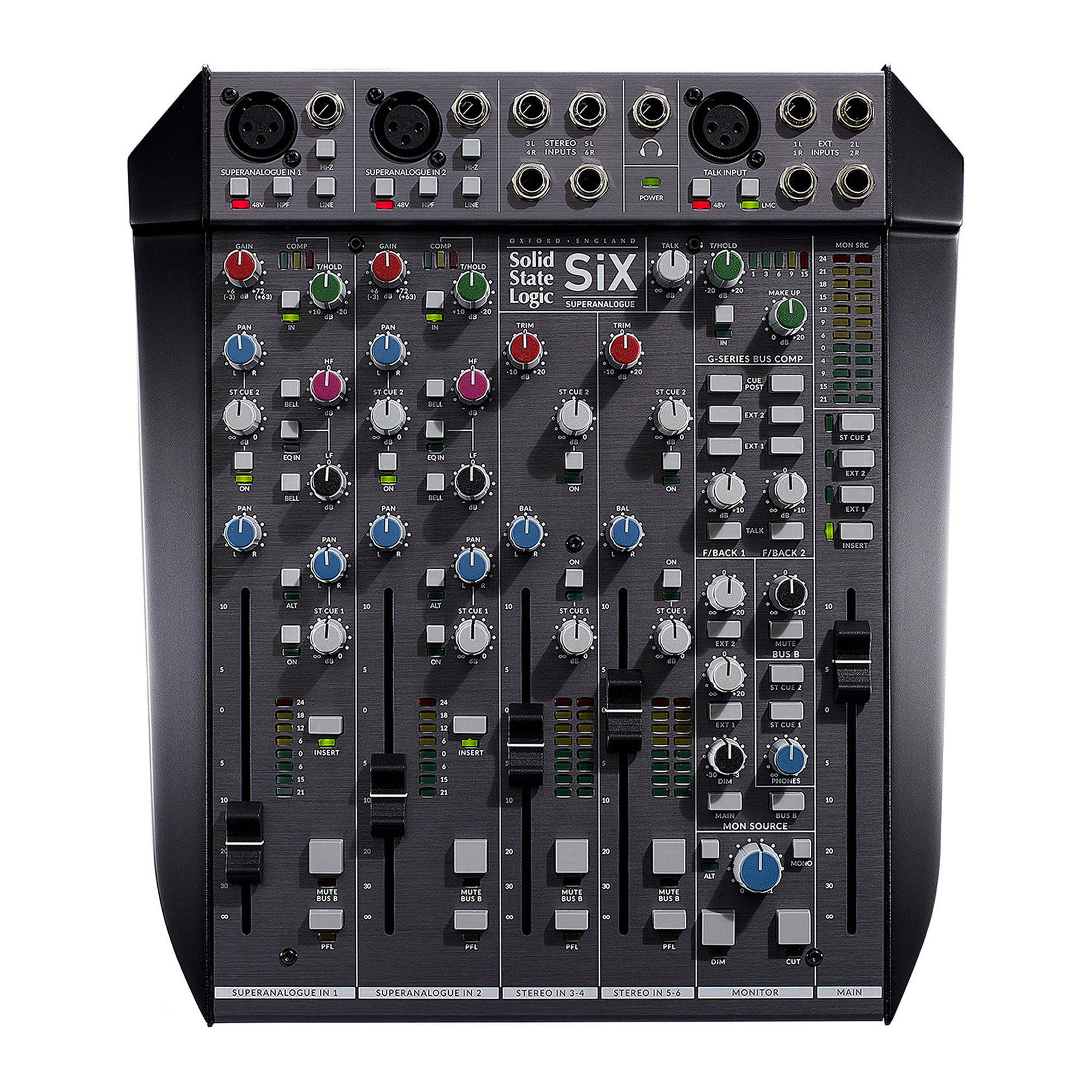 Solid State Logic SiX, созданный на основе 40-летнего опыта легендарных широкоформатных консолей SSL, представляет собой 6-канальный настольный мини-микшер-супераналог, обладающий высококачественной звуковой подписью SSL, мощной аналоговой обработкой и универсальной конфигурацией, что позволяет использовать его как дома, в студии, так и в дороге. Он оснащен двумя монофоническими входными каналами, каждый из которых содержит консольный микрофонный предусилитель SuperAnalogue с фантомным питанием, фильтр верхних частот и усилением до 72 дБ, а также линейный / Hi-Z 1/4" вход и два стереофонических входных канала. Моноканалы оснащены компрессорами с одной ручкой, 2-полосным эквалайзером и сбалансированными вставками для гибкой встроенной и выносной обработки, а все каналы оснащены плавными 100-миллиметровыми фейдерами.