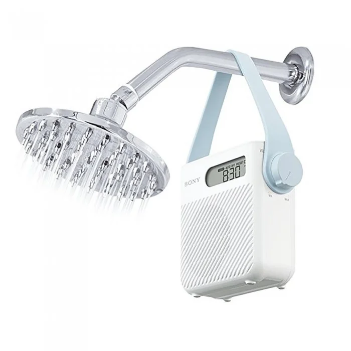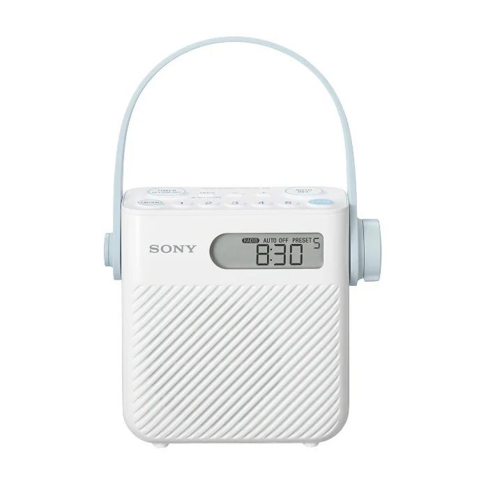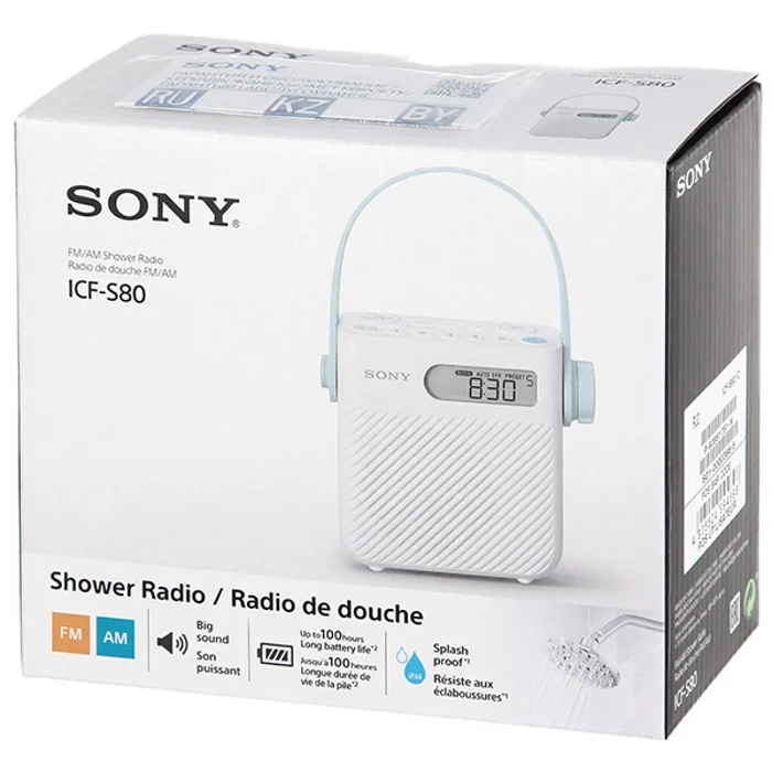 Стильный белоснежный радиоприемник Sony ICF-S80 с уникальной влагозащитной функцией станет лучшим другом меломана, не желающего расставаться с любимой радиостанцией даже во время приема ванны или душа. Устройство отличается высокой надежностью и простотой в управлении. Приемник можно закрепить на стене с помощью присоски или повесить на крючок, используя съемный резиновый ремешок. На передней панели Sony ICF-S80 находится динамик мощностью 500 мВт и небольшой дисплей, на котором отображается информация о включенной радиостанции или реальное время. Устройство имеет функцию автопоиска и работает в AM и FM-диапазонах. Еще двумя интересными особенностями радиоприемника являются таймер выключения. Модель работает от трех батареек R14, заряда которых хватит на 100 часов активной работы.