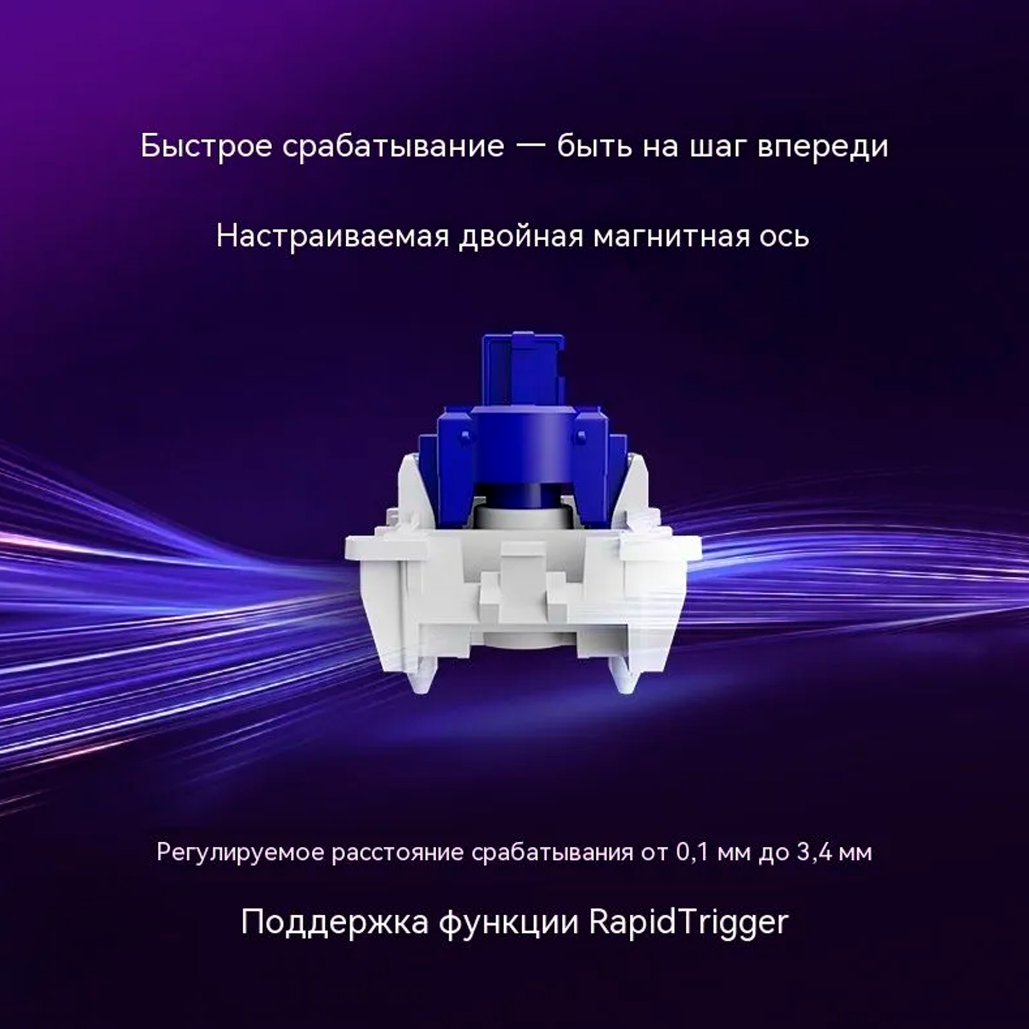 Найдите свой идеальный ход. Регулируйте точку срабатывания от 0,1 мм до 3,4 мм, чтобы получить полный контроль над скоростью отклика и тактильными ощущениями — будь то ювелирное движение или спам командами.