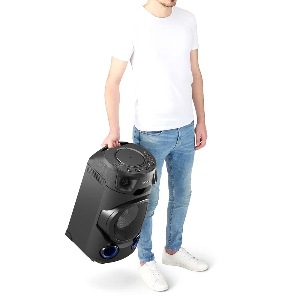 MHC-V13 имеет встроенные ручки для переноски, поэтому вы сможете легко перемещать систему из комнаты в комнату и даже брать ее с собой, отправляясь к друзьям. Благодаря жесткому пластиковому корпусу, защищающему устройство со всех сторон, и протекторам углов система MHC-V13 прослужит долго, и ее легко транспортировать на любую вечеринку.