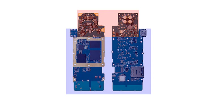 Разделив блок для обработки аудио (выделено красным) и цифровой фрагмент (выделено синим), нам удалось оптимизировать расположение этих элементов на печатной плате, чтобы предотвратить влияние цифрового шума на качество звука.