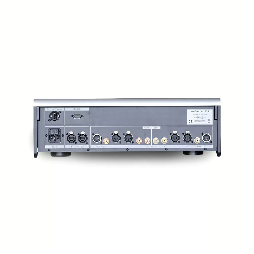 525 многое перенял от топовой модели Soulution 725 Preamplifier. Он использует ту же систему регулировки громкости, которая изящно сочетает плавное управление, характерное для переменных резисторов, с точностью и стабильностью, присущей сеткам фиксированных резисторов. Для 525 мы выбрали высококачественные резисторы Vishay Dale в сочетании с реле высшего класса. В итоге вы получаете крайне точную громкость, регулируемую в 95 шагах по 1 дБ каждый, без заметных щелчков при переключении. По-настоящему лучшее из обоих миров.