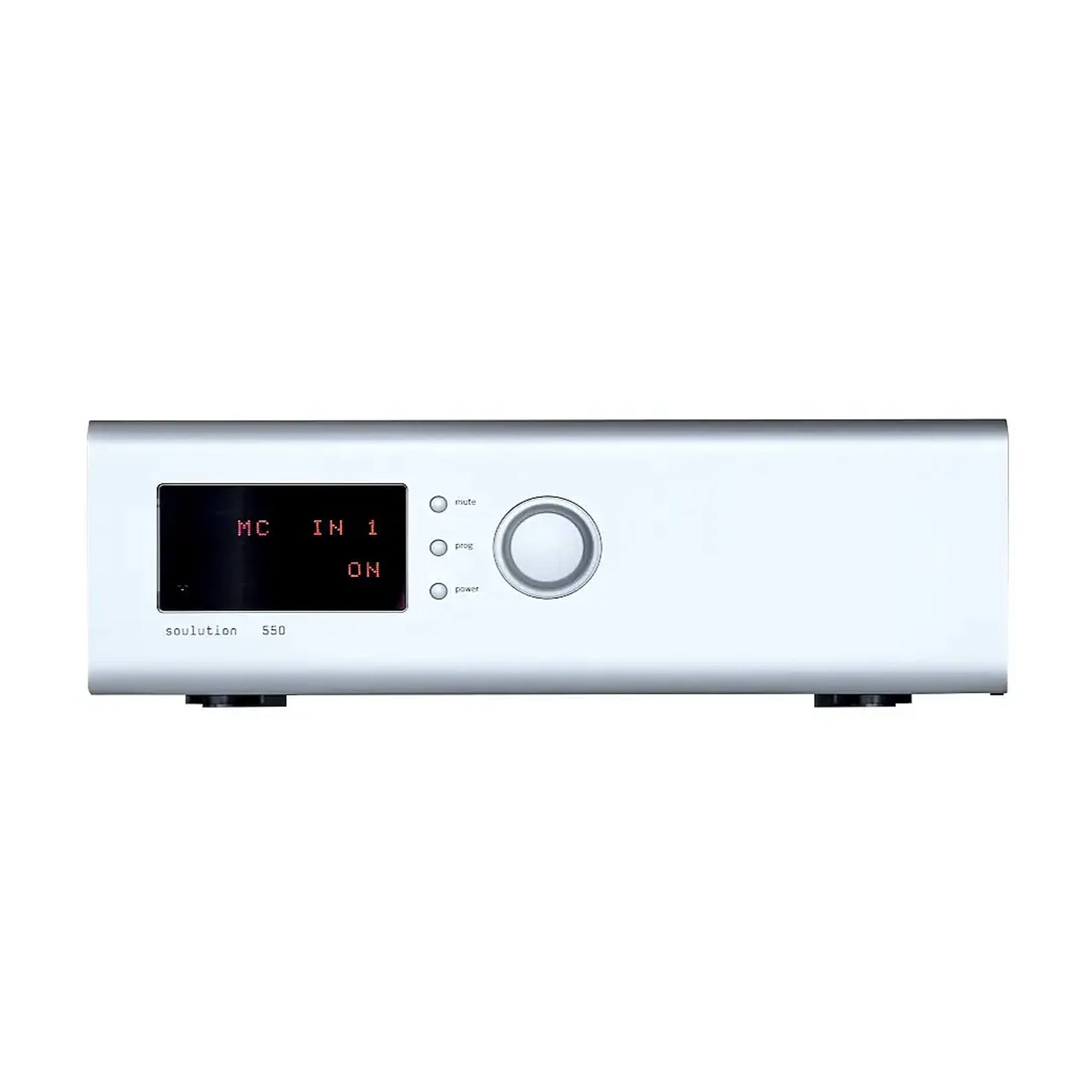 Фонокорректор Soulution 550 Phono имеет несимметричную конструкцию с двумя моно и отдельными источниками питания для левого и правого каналов, что гарантирует минимально возможные перекрестные помехи в канале. Оба входа 550 могут быть сконфигурированы для перемещения картриджей с магнитами или катушками, при этом сопротивление нагрузки выбирается с помощью передней панели или пульта дистанционного управления для каждого входа в отдельности.