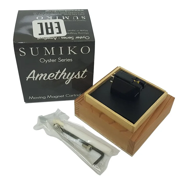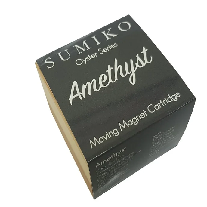 Головка звукоснимателя с подвижным магнитом Sumiko Amethyst входит в серию Oyster. В данной головке используется улучшенная конструкция генератора (преобразователя), благодаря которой удалось минимизировать шумы, получить потрясающую динамику и обеспечить исключительно точный трекинг (отслеживание звуковой дорожки). Модель эффективно использует преимущества мощных электродвижущих сил, характерных для MM-конструкций, благодаря чему обеспечивается четкое ритмичное звучание с отличным панчем. В этом плане Sumiko Amethyst даже превосходит некоторые сопоставимые по характеристикам головки с подвижной катушкой. Аккуратный закрытый корпус картриджа обладает хорошо продуманной геометрией, отлично противостоит паразитным резонансам и имеет симметричные скошенные боковины, а также выдвинутый вперед легкозаменяемый узел иглодержателя с вырезом для удобства настройки картриджа при его установке в шелл тонарма. На верхней стороне корпуса находятся два резьбовых отверстия для монтажа. Алмазная игла головки звукоснимателя Sumiko Amethyst отличается достаточно сложным профилем Nude Line Contact, с помощью которого можно получить исключительно точное звучание с великолепной детальностью. Игла крепится на легком алюминиевом держателе, а во внутренней разводке используется медный провод. Модель Sumiko Amethyst способна обеспечить широкий частотный диапазон и не предъявляет каких-либо особых требований к фонокорректору. Рекомендуемая прижимная сила для иглы составляет два грамма.