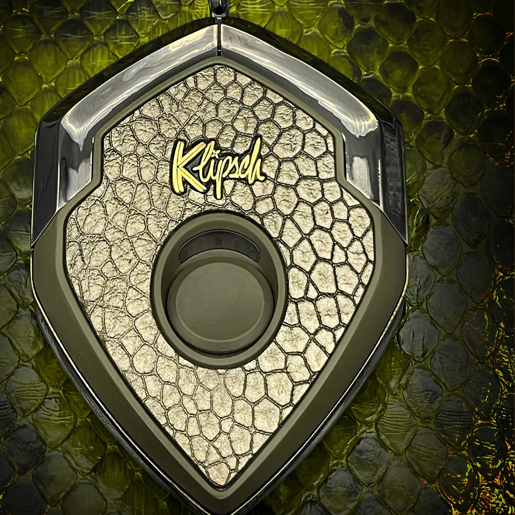 Модель Bonacorsi имеет незаметное матовое покрытие Midnight Bronze Cerakote, нанесенное поверх керамики YTPZ Ziconium. Металлический каркас зарядного устройства выполнен из контрастного полированного PVD-материала обсидианово-черного цвета. Вставки на обложке выполнены в виде ножки страуса из зеленого золота, а логотип Klipsch покрыт 24-каратным золотом.