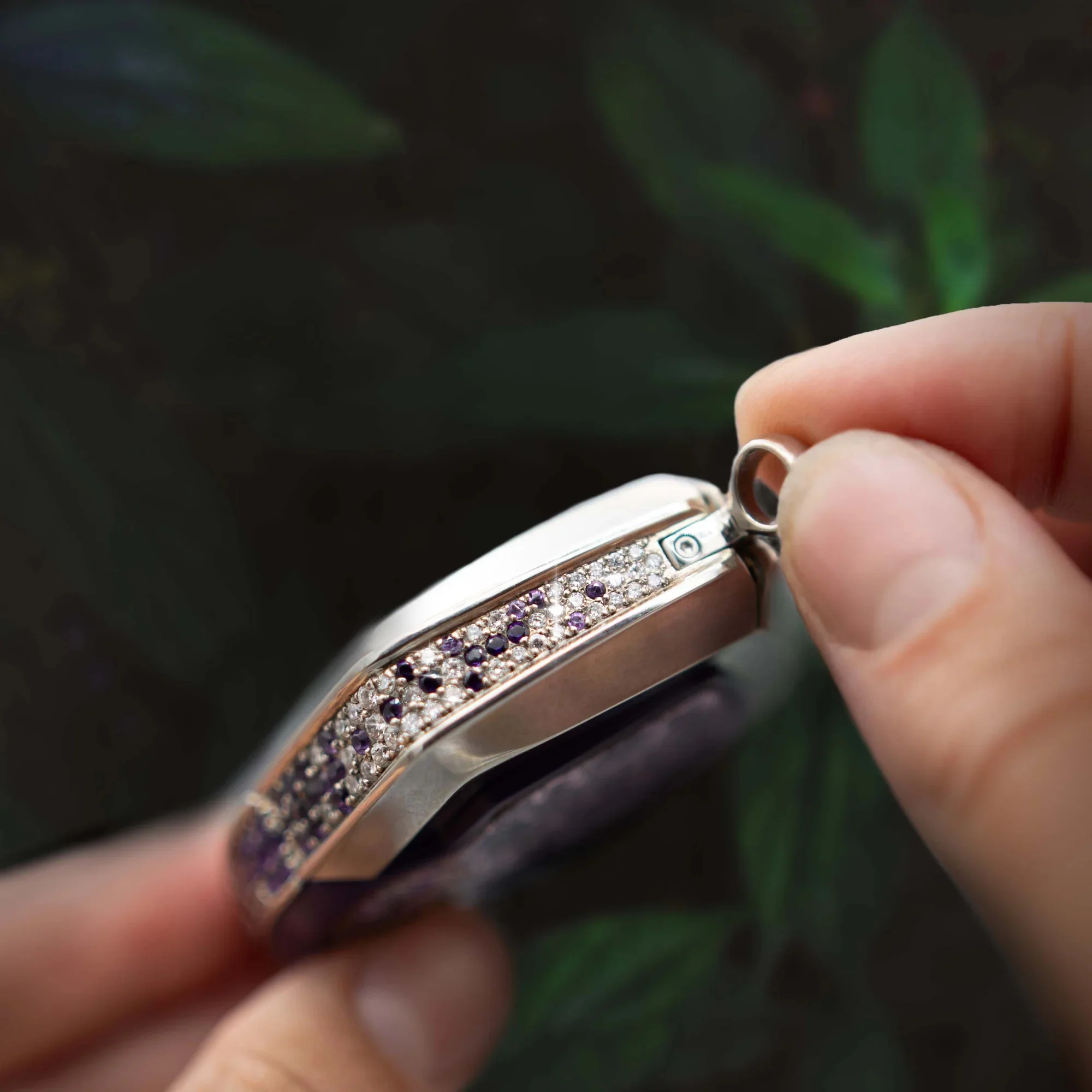 Модель Fleur de Glace Violette - это просто потрясающее украшение. Царственный фиолетовый керамический корпус Cerakote over YTPZ выполнен из почти 3 унций чистого белого 10-каратного золота и украшен 287 настоящими бриллиантами и аметистами общим весом чуть более 6 карат. Вставки на корпусе были разработаны собственным арт-директором Рэйчел Керстен (Rachel Kersten), благодаря смелому цветочному узору из пионов, нанесенному на роскошные металлические вставки из свиной замши.