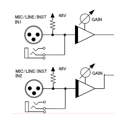 - отдельные входы для микрофонов, инструментов / источников линейного уровня;