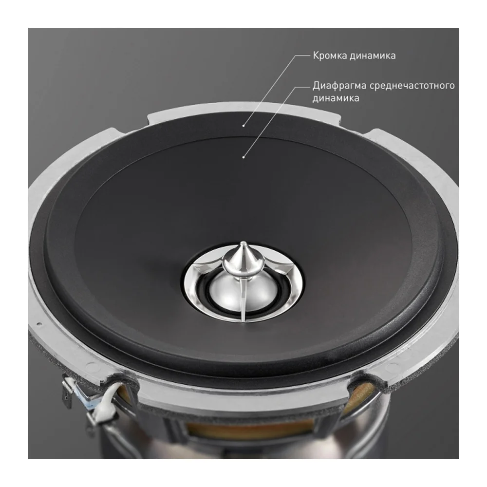 Магнитный контур состоит из двух магнитов, звуковой катушки и медного кольца для обеспечения поразительной мощности. Управление низкочастотным и средне- и высокочастотным динамиками осуществляется независимыми усилителями для исключения эффекта воздействия низких частот на среднечастотный или высокочастотный диапазоны. Это обеспечивает воспроизведение чистого и прозрачного звука.