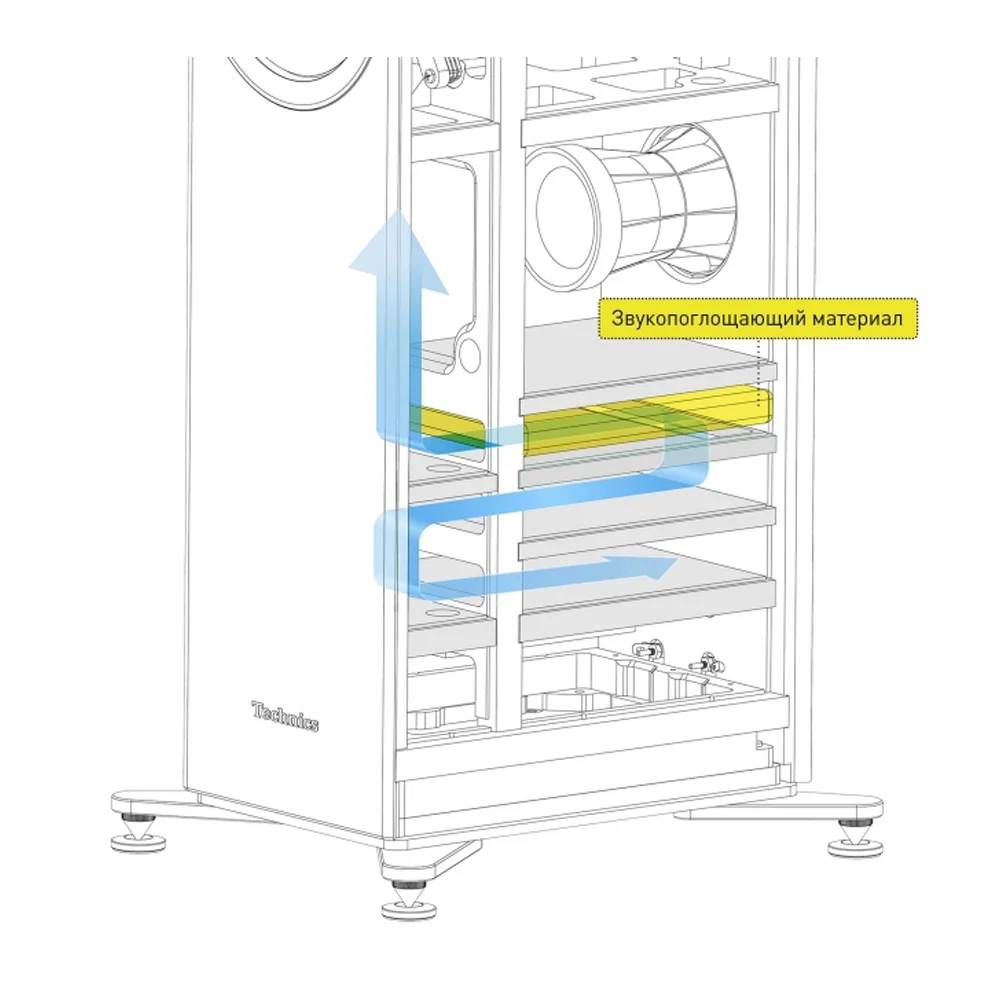 В качестве контрмеры в нижней части отделения для НЧ-динамика предусмотрена конструкция звукового тракта, которая направляет стоячие волны, вызывающие пиковые значения резонанса, при этом используется минимальное количество звукопоглощающего материала. (Запатентовано). Эта конструкция позволяет точного воспроизводить музыку, акустическая система передает правдоподобное и натуральное звучание в средне- и высокочастотном диапазонах.