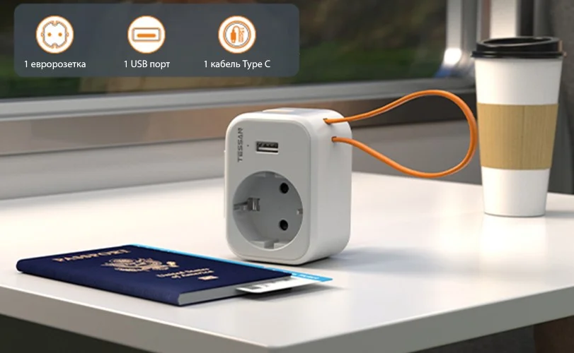 Сетевой фильтр с 1 розеткой 220В, 1 USB портом и 1 встроенным кабелем USB Type C. Компактная конструкция. LED индикатор. Огнеупорный материал корпуса. Надежные плотные разъёмы. Шторки защиты от детей.