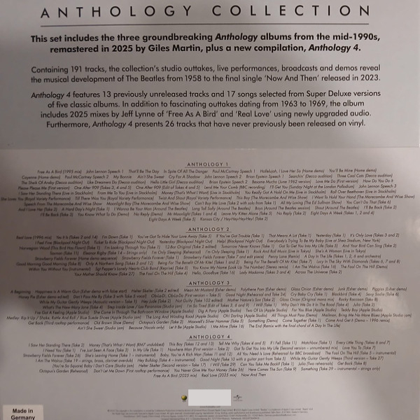 Особую ценность изданию придаёт «Anthology 4» - совершенно новый альбом, включающий ранее не публиковавшиеся композиции, уникальные ауттейки и специальные миксы 2025 года от Джеффа Линна для Free As A Bird и Real Love. Впервые на виниле выходят 26 треков, ранее доступных лишь в цифровом формате. Оформление заслуживает отдельного внимания: тройные разворотные конверты, редкие восстановленные фотографии, подробные аннотации Марка Льюисона и Кевина Хоулетта, а также внешний футляр с иллюстрацией Клауса Фурмана и съёмной o-card. В общей сложности бокс включает 191 композицию, демонстрируя эволюцию The Beatles от сырого рок-н-ролла до студийных экспериментов, навсегда изменивших популярную музыку.