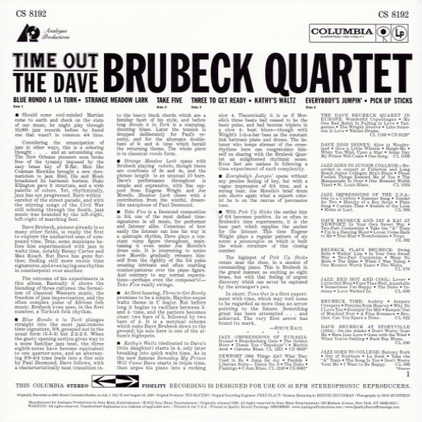 Это переиздание - идеально звучащее, мастерски отпечатанное, оформленное с любовью и уважением к оригиналу. Для любой коллекции винила «Time Out» - обязательный экземпляр.