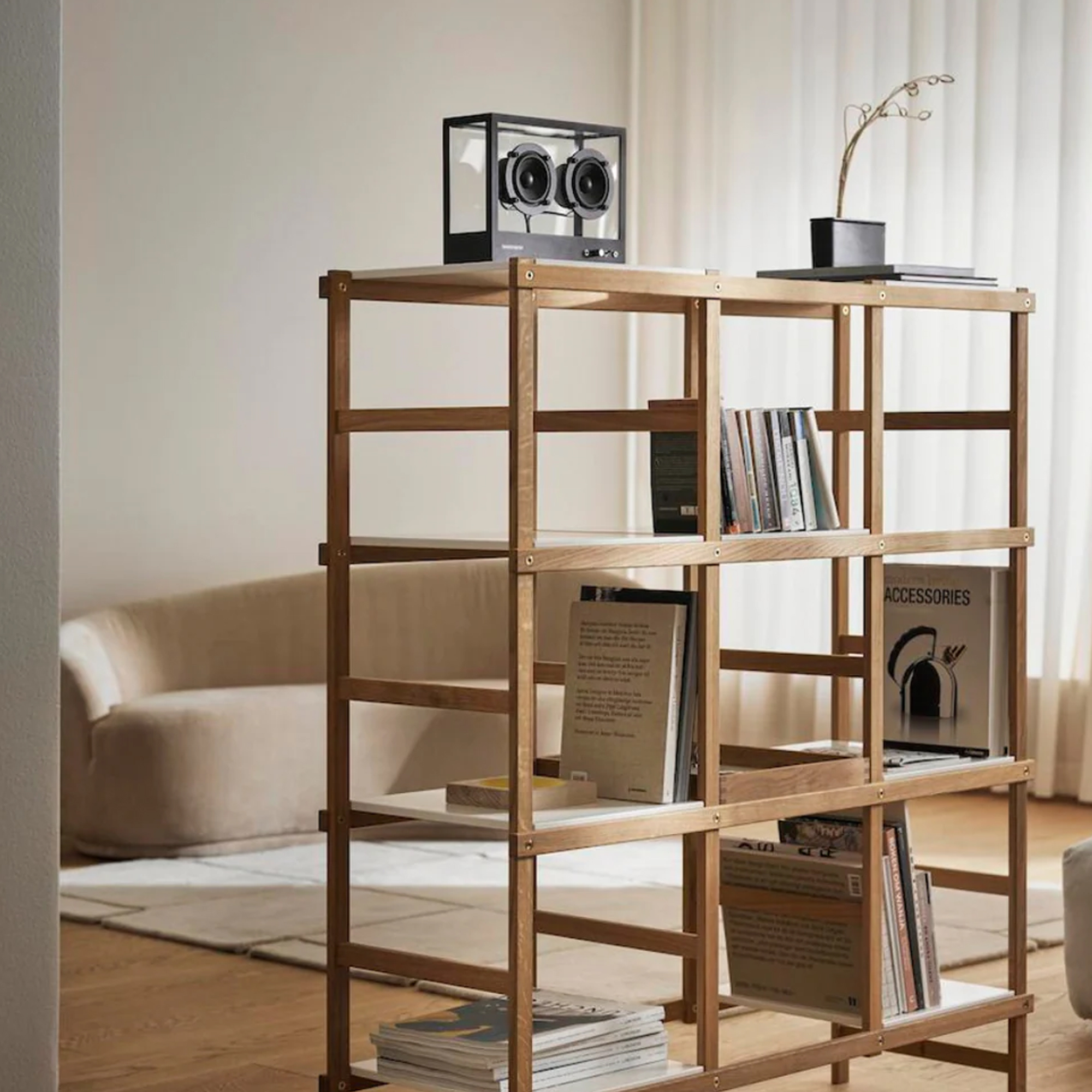 Как и большая модель, Small Speaker следует принципам «циркулярной экономики». Все компоненты разработаны с расчетом на легкую замену или апгрейд. Скрытый отсек позволяет пользователю в будущем обновлять модули беспроводной связи, продлевая срок службы устройства.