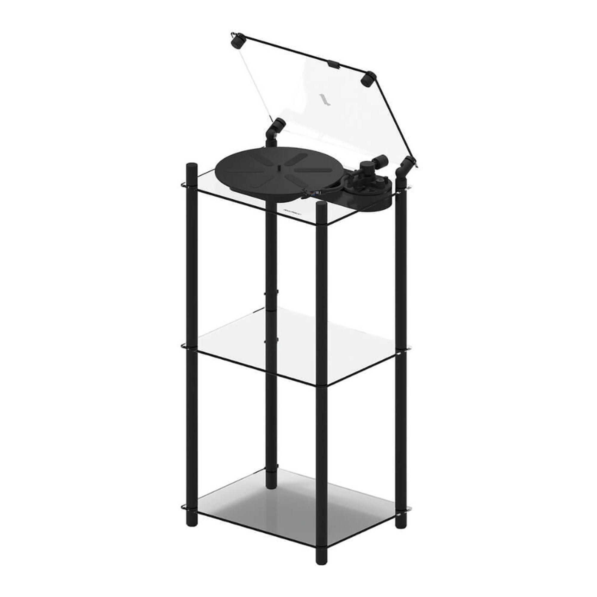 Стойка продолжает фирменную философию бренда: она выполнена из тех же материалов — прочной алюминиевой рамы и полок из закаленного стекла. Это обеспечивает визуальную легкость конструкции и позволяет проигрывателю как бы «парить» в воздухе. Минималистичный скандинавский дизайн стойки универсален и органично вписывается в современные интерьеры.