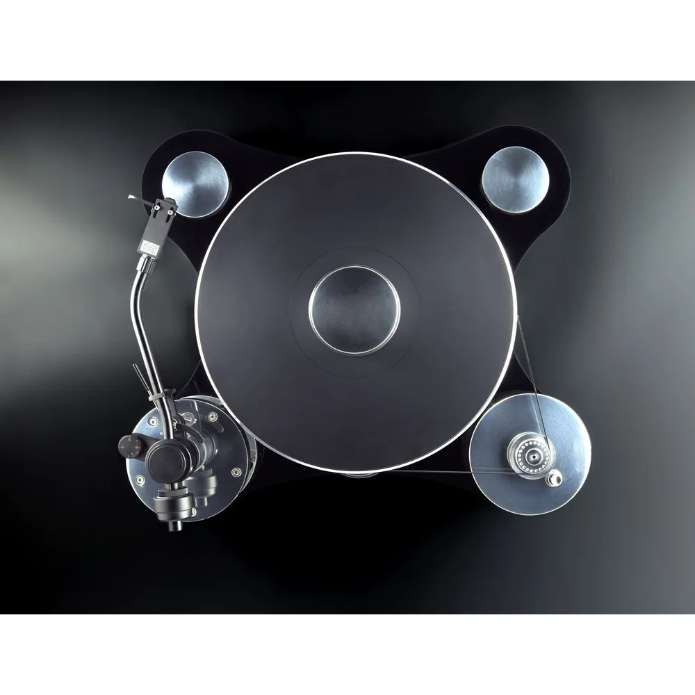 В тяжелом основании 2 пластины из черного акрил-карбоната разделены полированной алюминиевой прослойкой, оно располагается на регулируемых по высоте опорах-шипах. Ножки под шипами позволяют выбрать между жесткой или мягкой установкой проигрывателя. Конструкция очень удобна, установка и регулировка по уровню стола занимает не более двух минут.