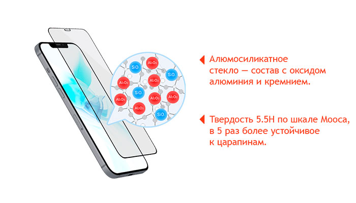 Свойства аминосиликатного стекла обеспечивают ему впечатляющую твердость — 5.5H по шкале твердости минералов Мооса.