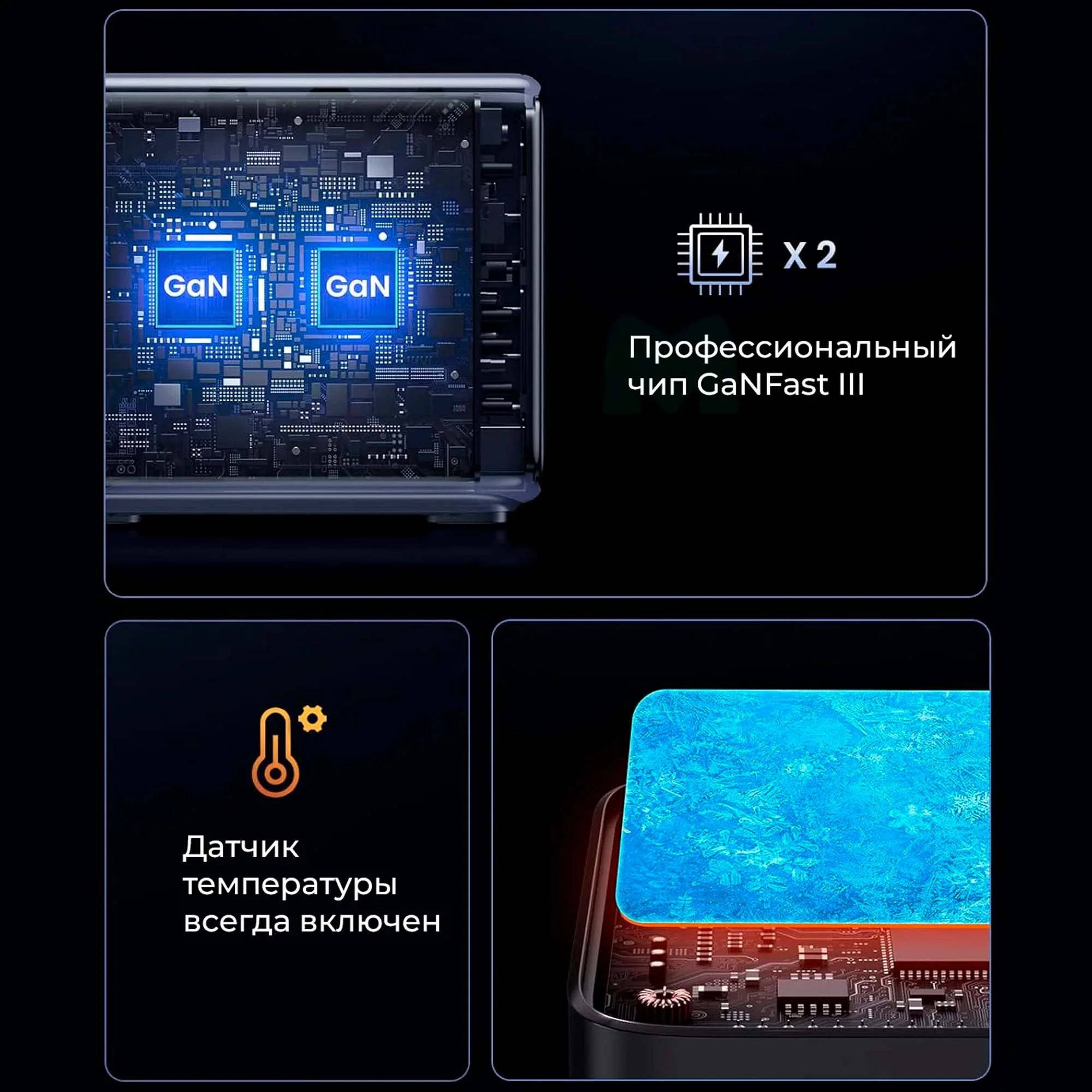 Благодаря революционной технологии GaN эффективность зарядной станции мощностью 300 Вт значительно увеличена, размер уменьшен, а тепловыделение улучшено; система термозащиты измеряет температуру 800 раз в секунду в реальном времени, защищая ваше устройство от короткого замыкания; система интеллектуального распределения мощности регулирует выходную мощность для защиты аккумулятора ваших устройств.