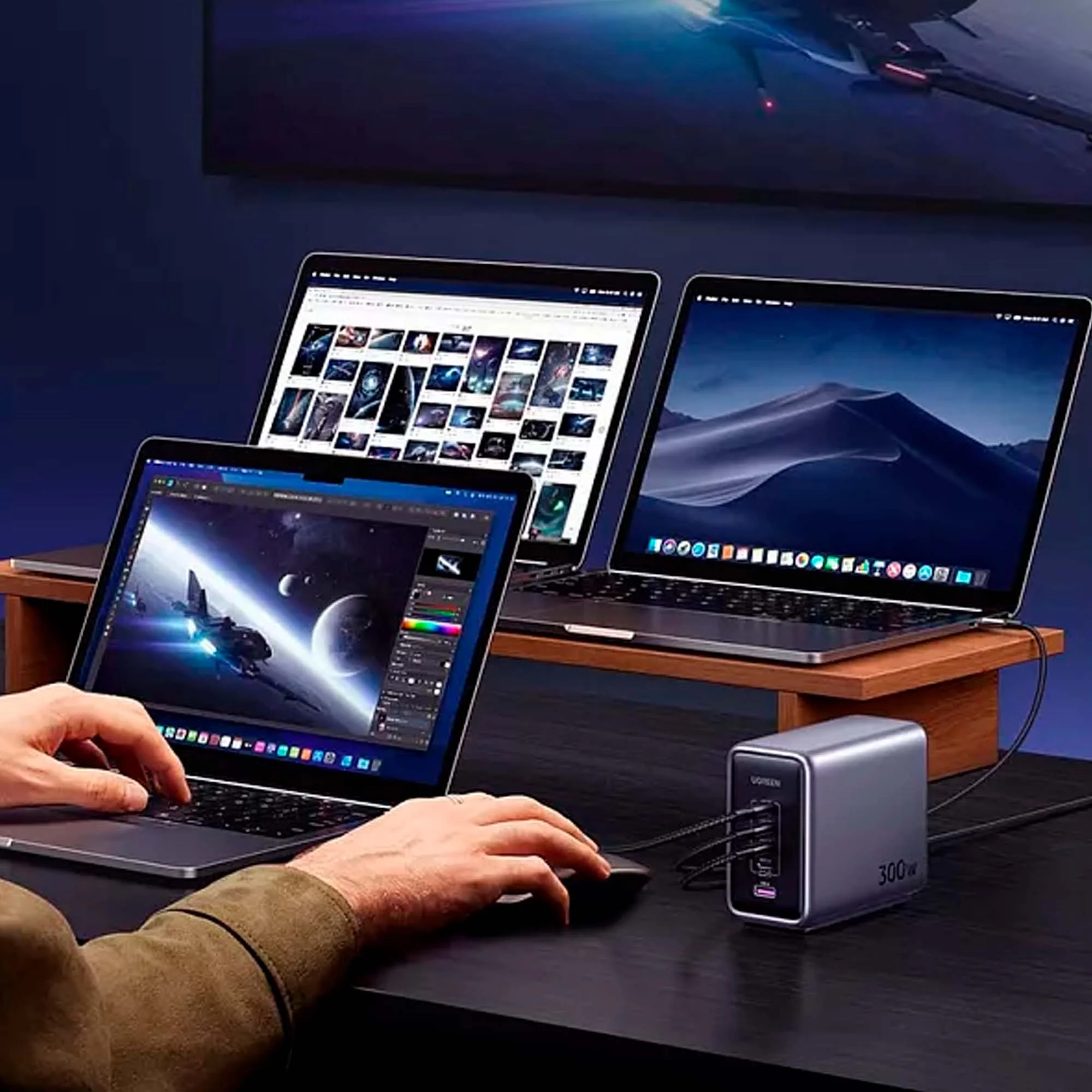 Благодаря отличной производительности зарядное устройство GaN может питать 3 ноутбука одновременно. С 4 портами USB-C и 1 портом USB-A зарядник USB C мощностью 300 Вт заряжает одновременно 5 устройств - от ноутбуков до планшетов и смартфонов, повышая вашу продуктивность в офисе.