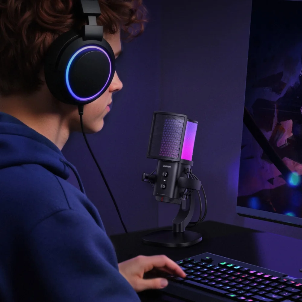 Улучшите качество звука с помощью настольного USB-микрофона UGREEN CM581, предназначенного для стримеров, создателей контента, геймеров и профессионалов, которым требуется кристально чистый звук, иммерсивное освещение и удобство подключения к интернету. Благодаря RGB-подсветке и подавлению фонового шума этот USB-микрофон придаст вашему рабочему столу стиль и производительность.