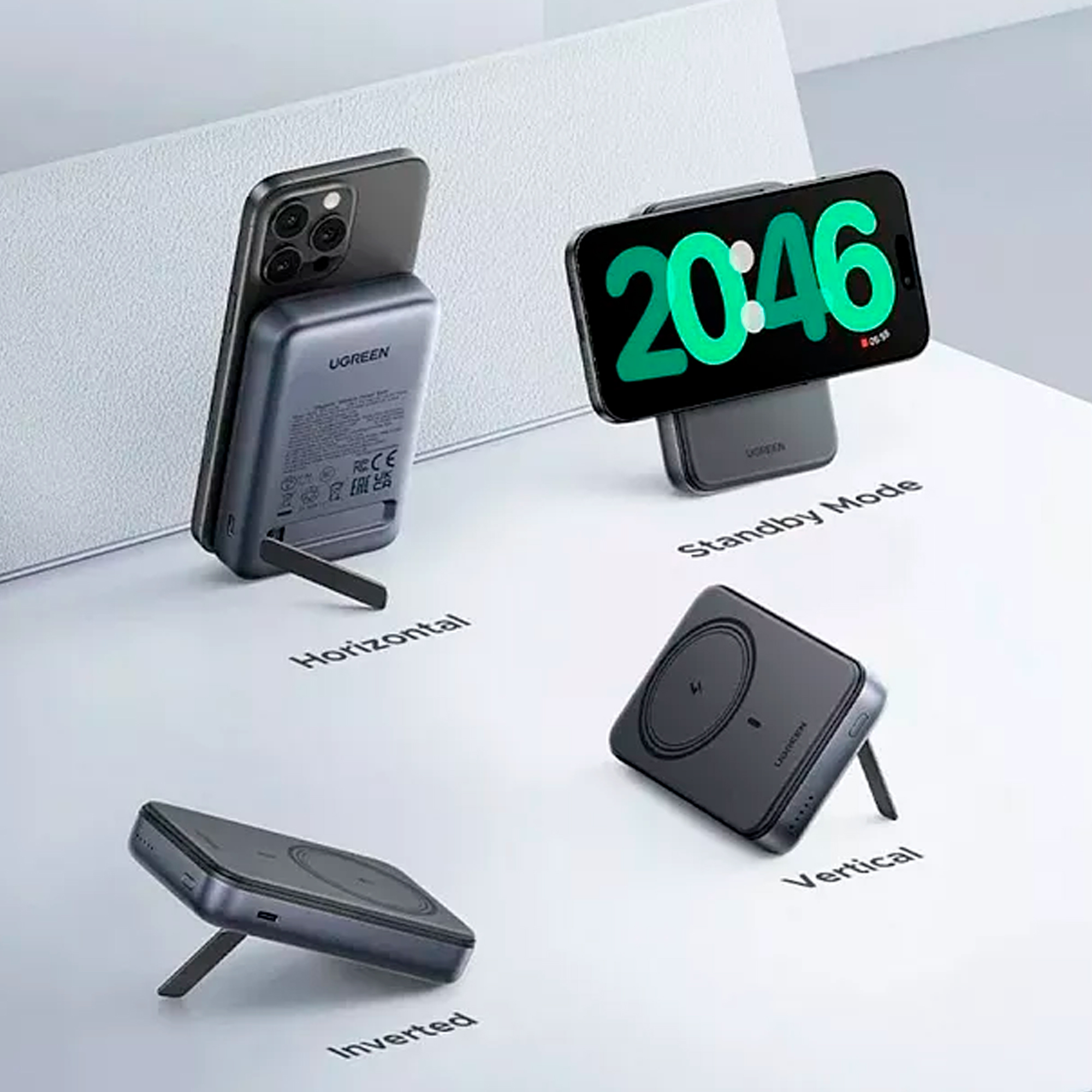Беспроводной внешний аккумулятор с магнитным креплением и встроенной складной подставкой. Его емкость составляет 10000 мАч, чего достаточно для нескольких зарядок смартфона.
