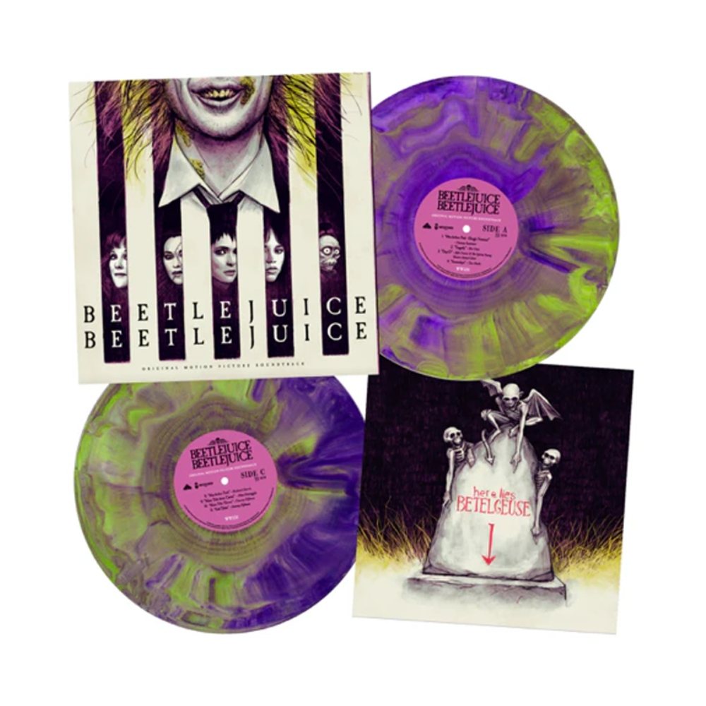 Пластинки изготовлены из уникального лаймово-зелёного и фиолетового винила, вручную отлитого для создания завораживающего мраморного эффекта, напоминающего о причудливой визуальной палитре фильма.