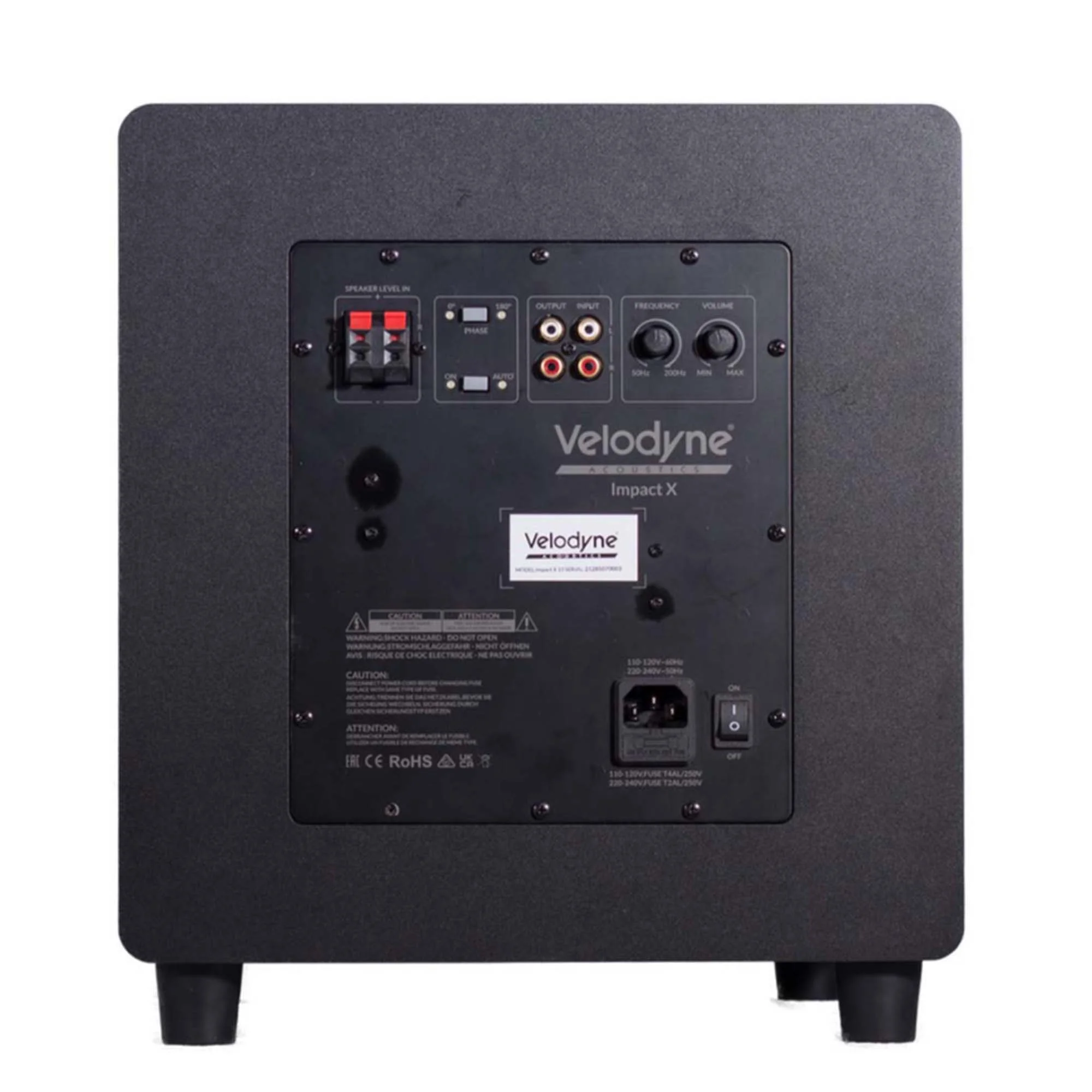 Выпущенная компаний Velodyne Acoustics линейка активных сабвуферов Impact X предлагает на выбор два варианта: десятидюймовый сабвуфер Impact X 10, предназначенный для небольших комнат, и Impact X 12 предполагающий установку в достаточно просторных помещениях. В обеих моделях драйверы расположены спереди и поддерживаются направленным вниз оптимизированным портом фазоинвертора.
