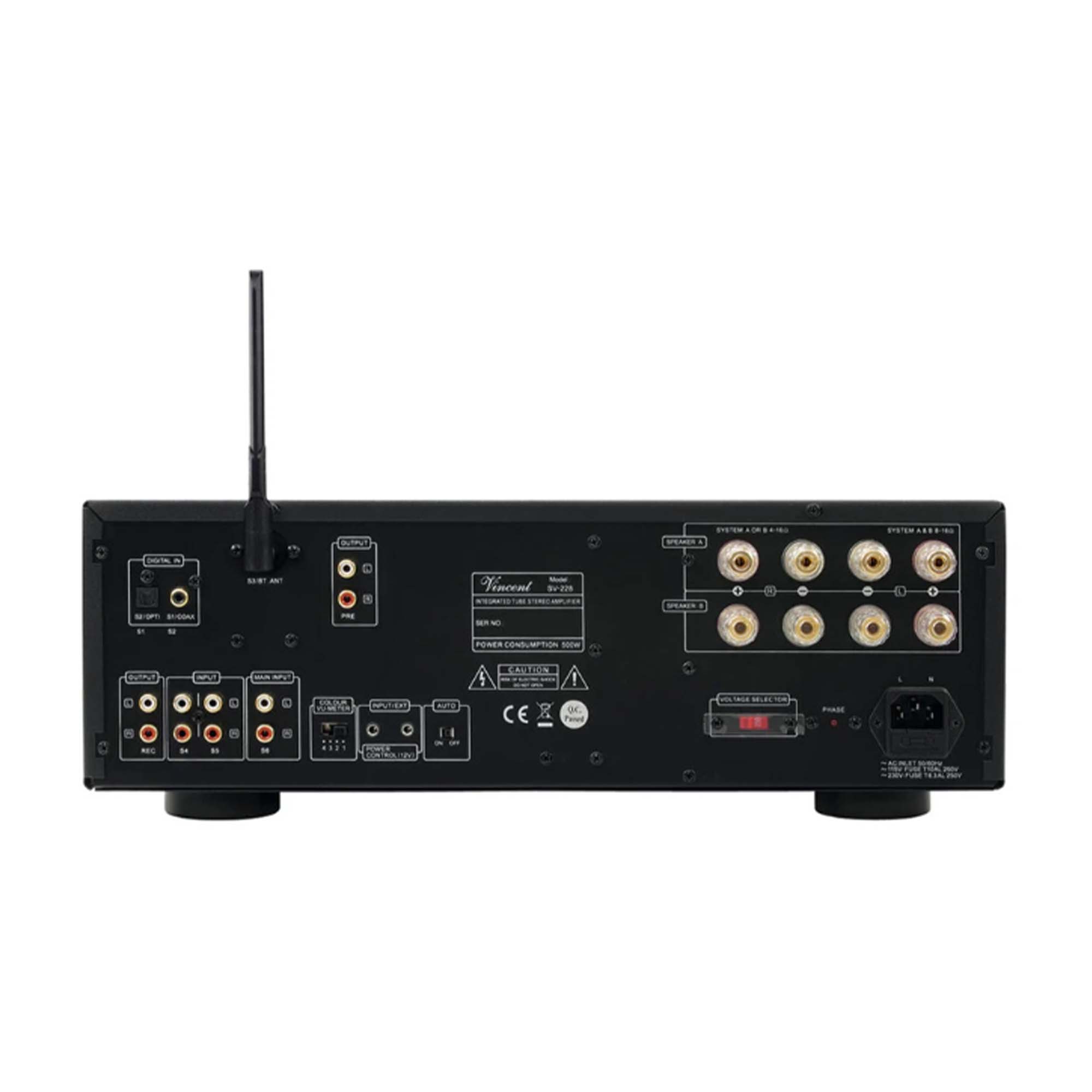 Интегральный усилитель Vincent SV-228 имеет гибридную конструкцию с ламповыми предварительными каскадами, оконечными на полупроводниках и встроенным Bluetooth-приемником. Украшен стрелочными индикаторами на фронтальной панели.