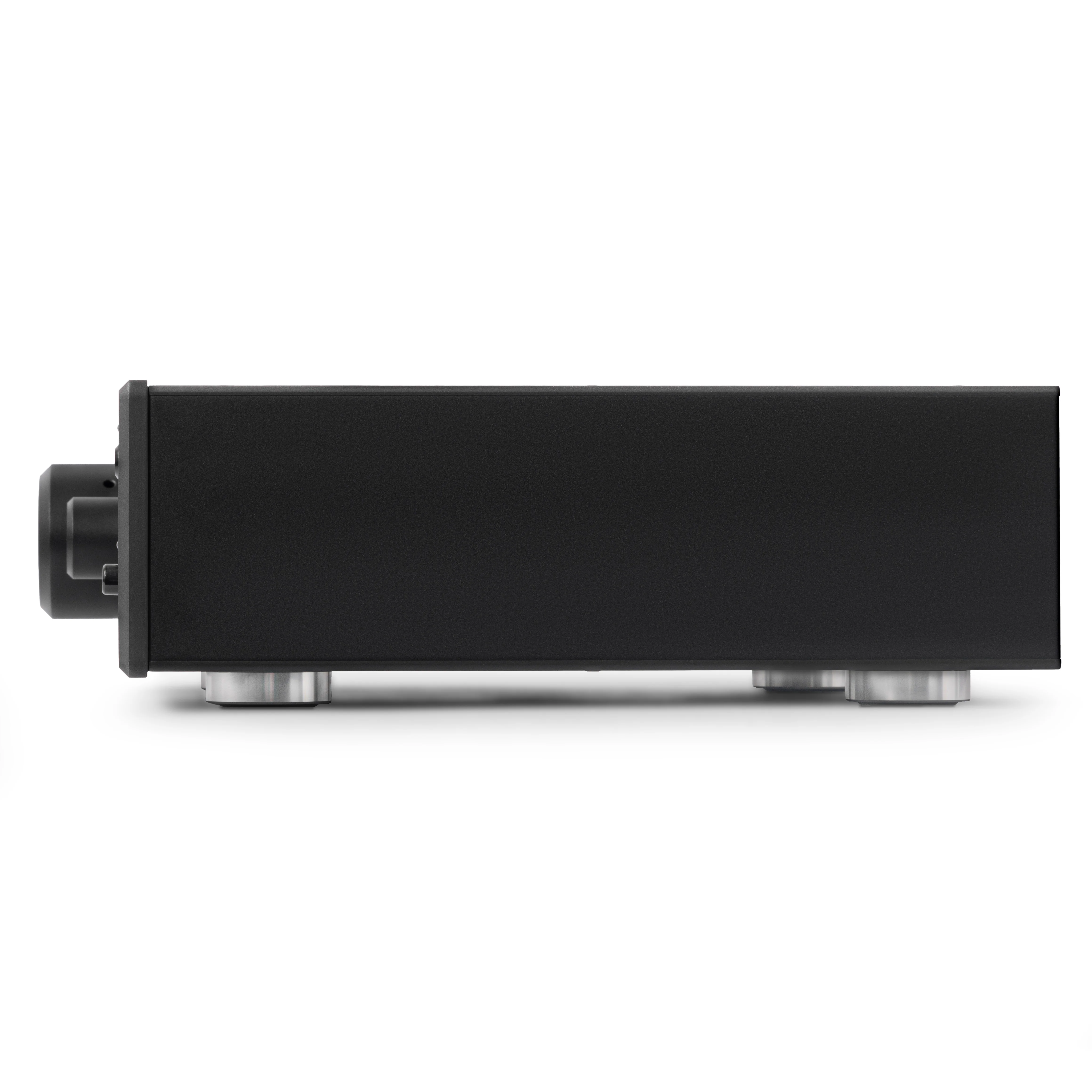 Дополнительные цепи защищают устройства от постоянного тока, перегрузки или перенапряжения и задерживают процесс включения для защиты наушников. Все компоненты тщательно собираются вручную и устанавливаются в тонкий корпус из черного анодированного алюминия с передней панелью толщиной в миллиметр.