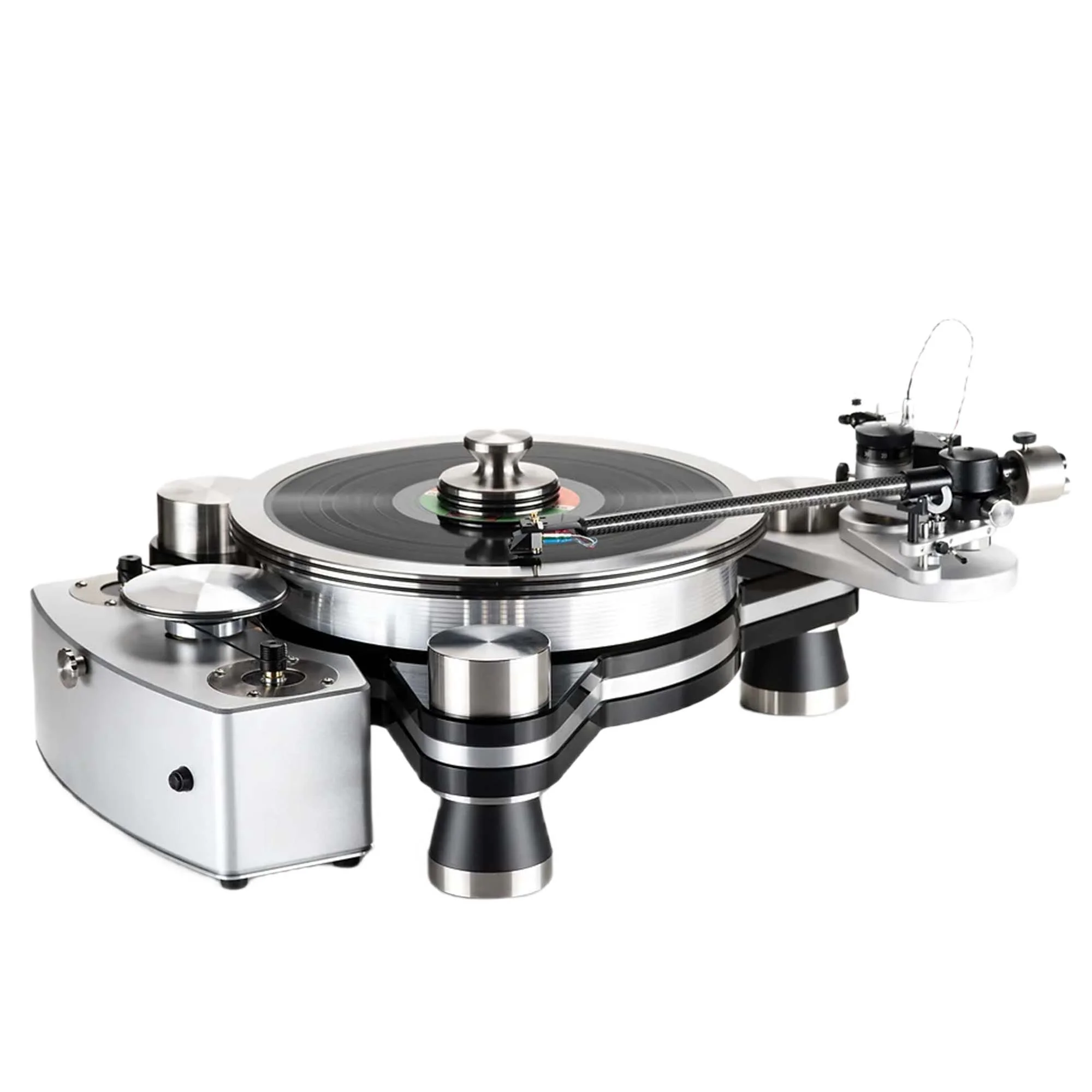 Алюминиевый диск весом 9.9 кг изготовлен с допуском +/- 0.02 мм из сплава 6061 и имеет окружность 991 мм. Шкив мотора изготовлен с допуском +/- 0.001 мм. Периферийное прижимное кольцо для исправления геометрических дефектов пластинки.