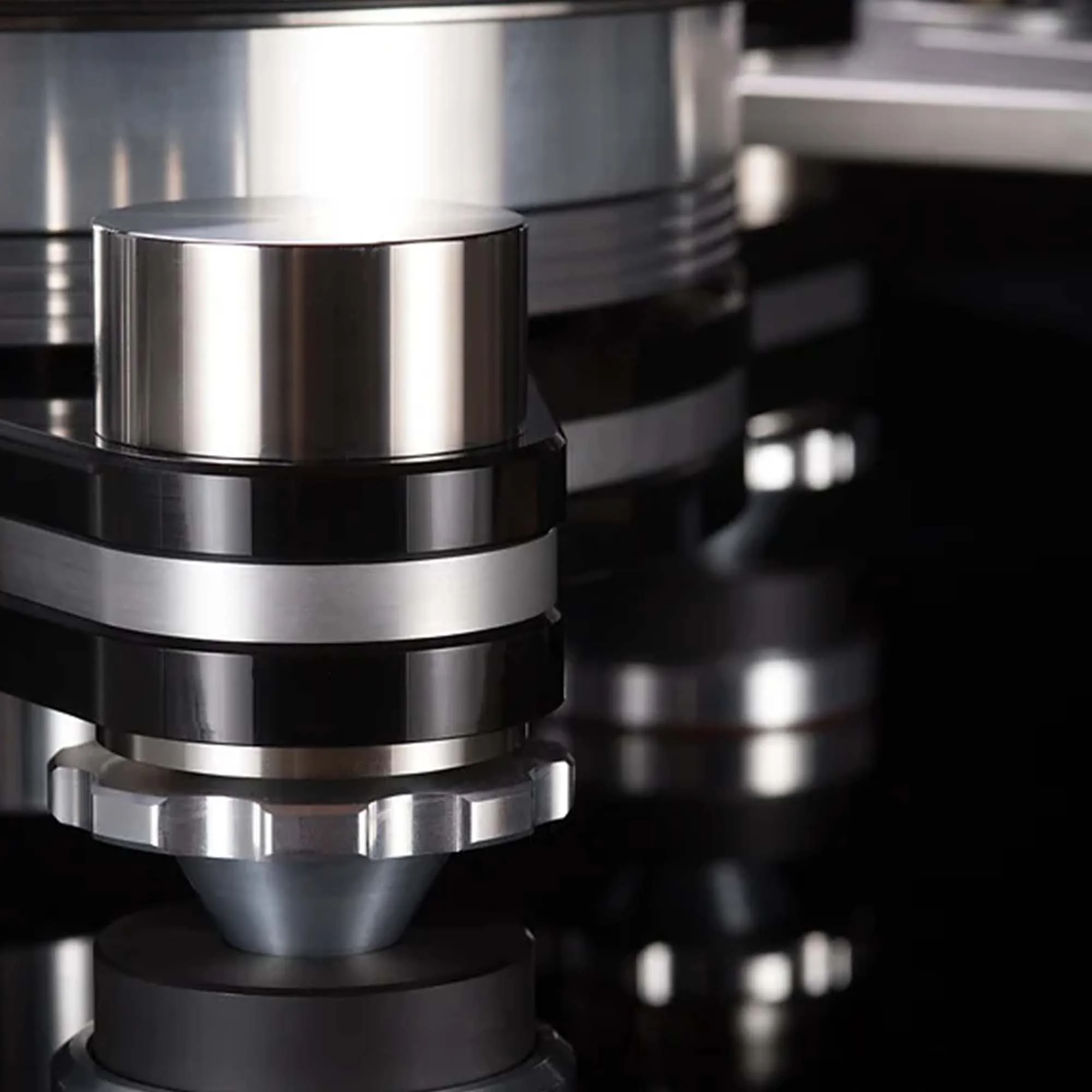 Шкив мотора изготовлен с допуском +/- 0.001 мм. Периферийное прижимное кольцо для исправления геометрических дефектов пластинки. ADS блок управления двигателем (Analog Drive System) для обеспечения предельной точности частоты вращения двигателя и удобного переключения скорости.