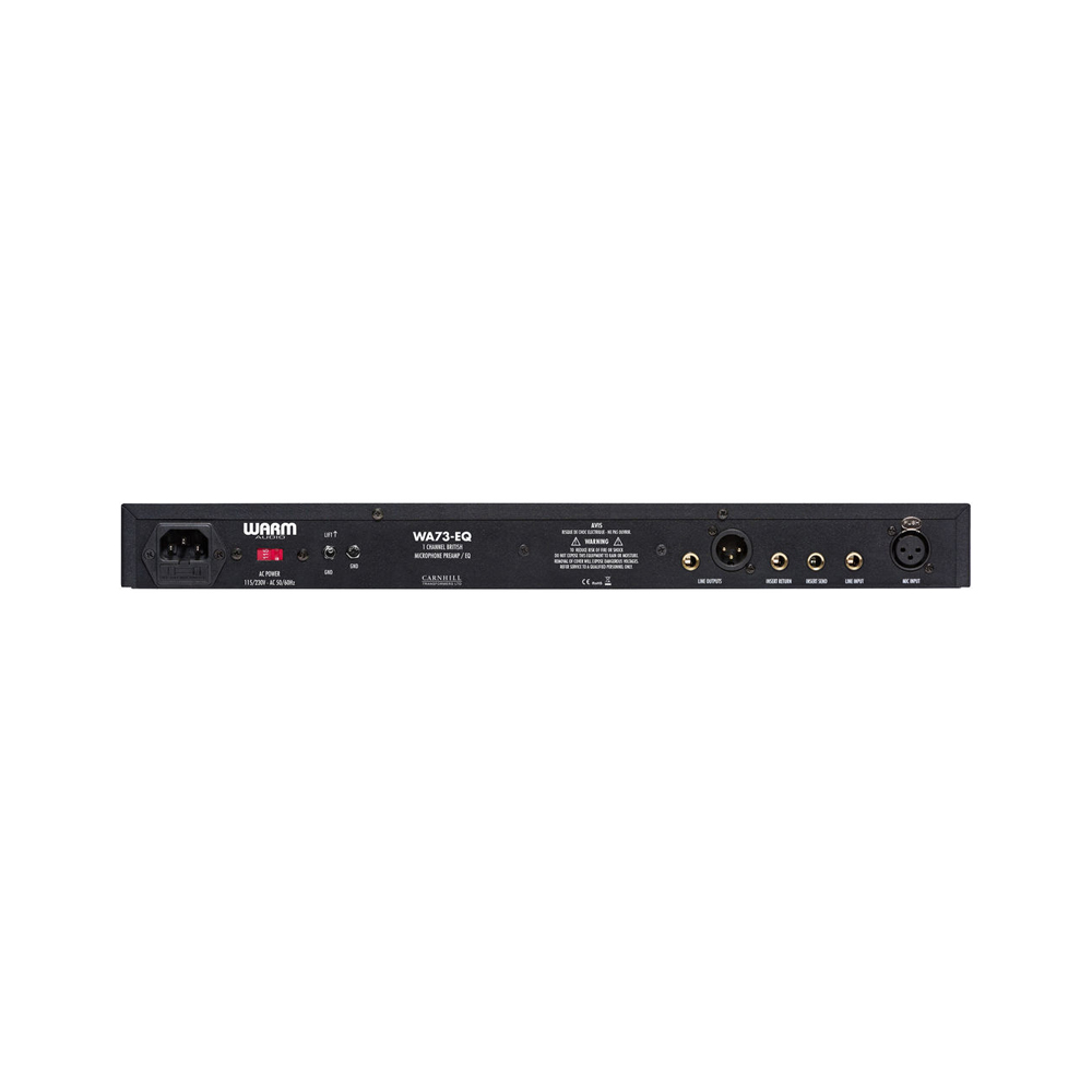 В сотрудничестве с Cornhill Transformers были созданы трансформаторы, создающие приятное для слуха насыщение при увеличении уровня сигнала. Для соответствия тому самому старому британскому звучанию в сигнальном тракте применены танталовые и полистироловые конденсаторы, а также дающие более мягкое звучание выходные транзисторы. Предусилитель может предоставлять фантомное питание 48В для конденсаторных микрофонов. Он оснащен четырехпозиционным ВЧ-фильтром на 50, 80, 160 и 300 Гц. Предусилитель позволяет производить усиление на позициях до 80 дБ, переключатель усиления активизируется с помощью резистора. Кнопка TONE на лицевой панели устройства меняет сопротивление входного трансформатора для создания переменного тона. Также на поверхности есть переключатель полярности. При изготовлении предусилителя Warm Audio WA73-EQ используется ручная сборка. Предусилитель имеет рэковый корпус высотой 1U.