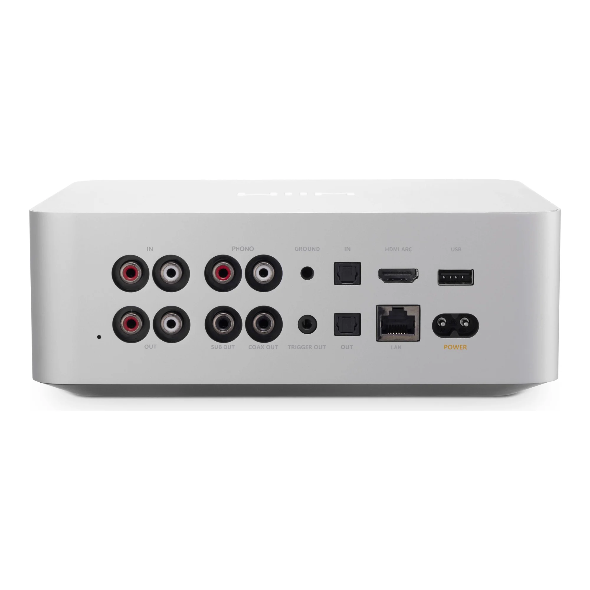 Коммутационный арсенал WiiM Ultra включает вход фонокорректора Phono с разъёмом заземления, порт HDMI ARC, разъём миниджек 3.5 мм на передней панели для подключения наушников, оптический вход/выход, аналоговый линейный вход/выход, цифровой коаксиальный выход, выход на сабвуфер и порт USB-A для воспроизведения мультимедиийных файлов с флешек. Для интеграции в домашнюю компьютерную сеть предусмотрен адаптер Wi-Fi и порт Ethernet RJ45. Есть здесь и 12-вольтовый триггер для управления, например, усилителем.