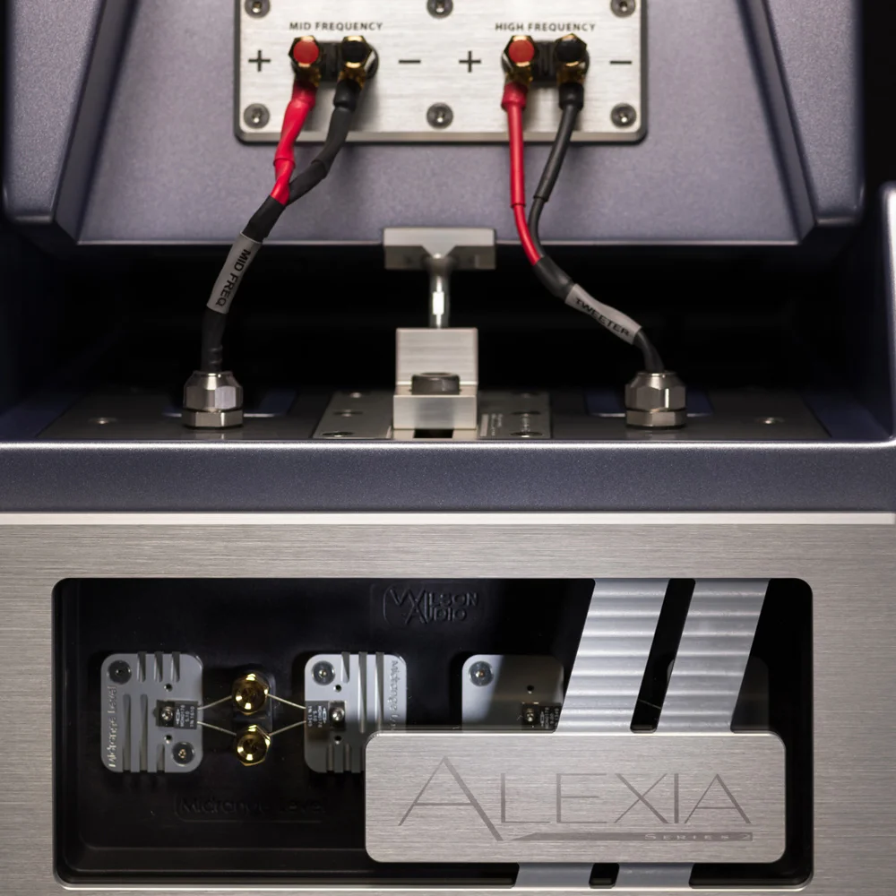 В Alexia Series 2 применена новая система топологии (трехмерного расположения) внутренней проводки, впервые опробованная в вершине творческих достижений Дэвида Уилсона - WAMM Master Chronosonic. В эту систему входят герметичные выходные "шлюзы", благодаря которым передача сигнала по проводам осуществляется без лишних паек или клемм, а также отпадает необходимость отдельного бокса для разделительного фильтра. За счет новой топологии внутренний объем корпуса увеличивается, а его внешние габариты остаются прежними. В результате Wilson Audio добилась увеличения внутреннего объема СЧ-бокса на 26.4%, а в для НЧ-блока увеличение составило 10.8%. Опираясь на новый расчетный объем, коллектив разработчиков смог оптимизировать характеристики СЧ-громкоговорителя и двух НЧ- излучателей.