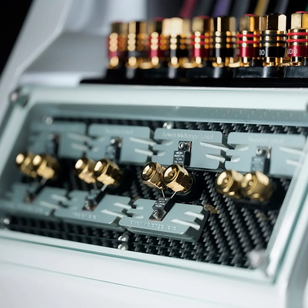 Основную часть диапазона здесь воспроизводит сборка из четырех драйверов – трех СЧ-головок и купольного твитера с мягкой мембраной. Аналогичная пищалка установлена сзади, причем ее отдачу можно тонко подстроить в диапазоне от 0 до -37 Дб. Это необходимо не только для адаптации Wilson Audio Chronosonic XVX под конкретное помещение, но и для выравнивания общей фазово-временной характеристики.