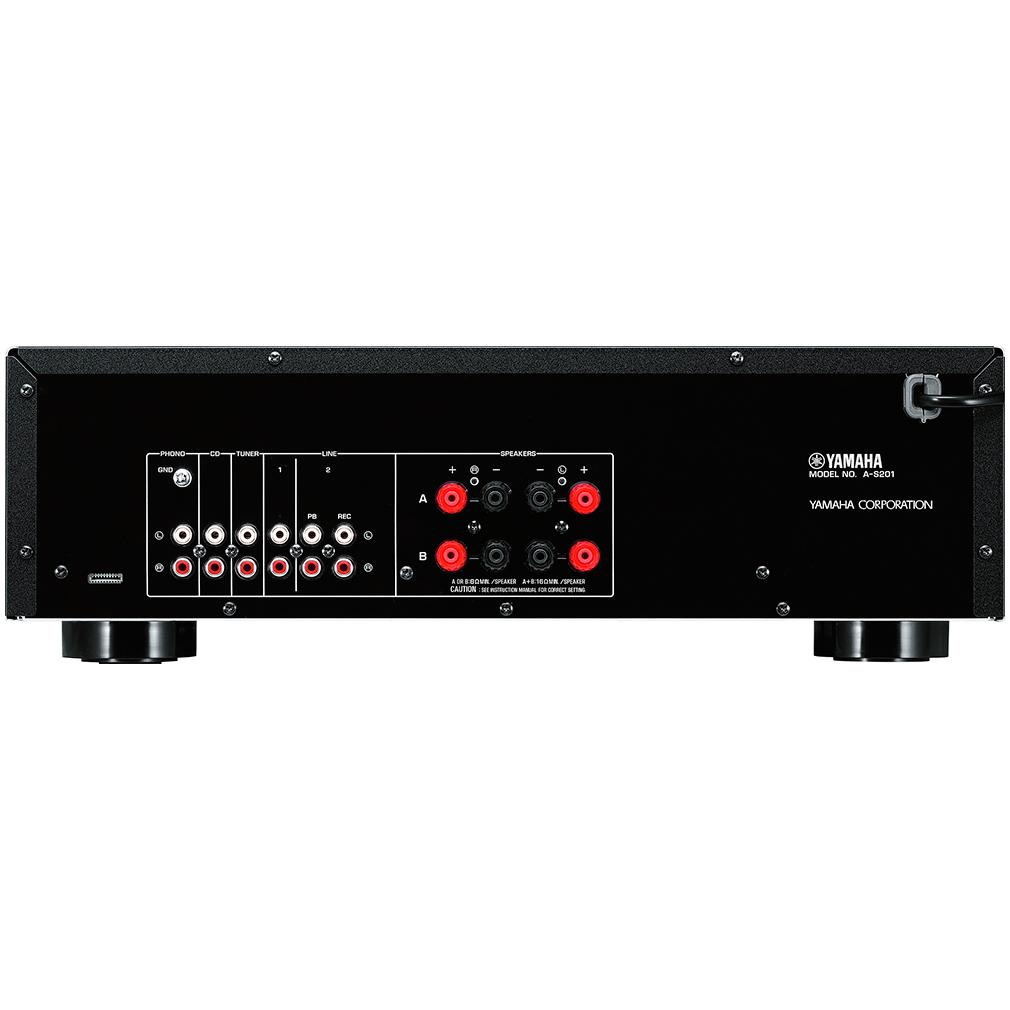Имеет регулировку тембра в области низких и высоких частот с помощью кнопок на передней панели. Кроме того, можно задействовать режим Pure Direct, подав входной сигнал в обход дополнительных схем. Усилитель имеет встроенный фонокорретор для MM-звукоснимателей проигрывателей винила, тремя линейными входами, а также входом и выходом для записывающего устройства. Также на передней панели Yamaha A-S201 имеется гнездо для подключения наушников.