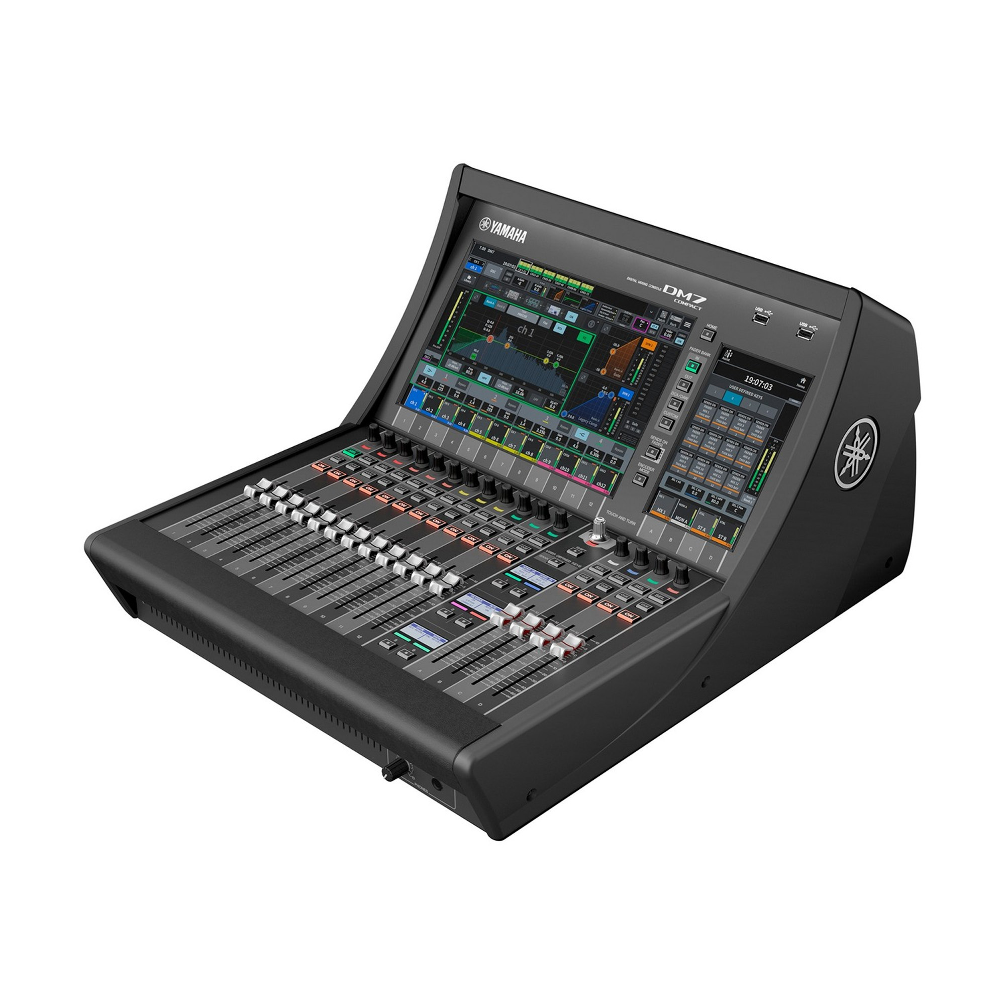 В DM7 Compact продуман каждый элемент управления для максимальной эффективности работы. Центром управления является 7-дюймовый сенсорный дисплей высокой четкости, который обеспечивает прямой и визуально понятный доступ к самым востребованным функциям, таким настройка эквалайзера, работа с плагинами или управление сценой. Это избавляет от необходимости пробираться через многоуровневые меню. Интерфейс дополнен физическими фейдерами, кнопками и энкодерами, расположенными в непосредственной близости от сенсорного экрана. Этот гибридный подход позволяет работать мышечной памятью, быстро внося коррективы во время живого выступления, и при этом иметь полный визуальный контроль над сложными студийными задачами. Микшер становится не просто инструментом, а естественным продолжением звукорежиссера.
