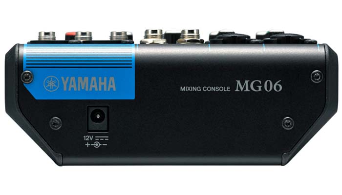 На борту Yamaha MG06 находятся 2 комбинированных входа XLR/TRS с предусилителями, аттенюатором 26 дБ и НЧ-фильтром 80 Гц. Линейные источники подключаются в TS-каналы 3/4 (небалансные) и 5/6. На комбинированных каналах есть ручка гейна до +64 дБ, двухполосный эквалайзер в виде ручек с усилением/ослаблением до +15/-15 дБ и ручка регулировки уровня с усилением до +10 дБ. Наконец, на этих каналах есть светодиодные пик-индикаторы, показывающие опасное превышение уровня. На линейных TS-входах 3/4 и 5/6 есть только ручки регулировки уровня. Выходы представлены двумя разъемами XLR-M, дополнительным стереовыходом на двух разъемах TS и TRS-выходом на наушники.