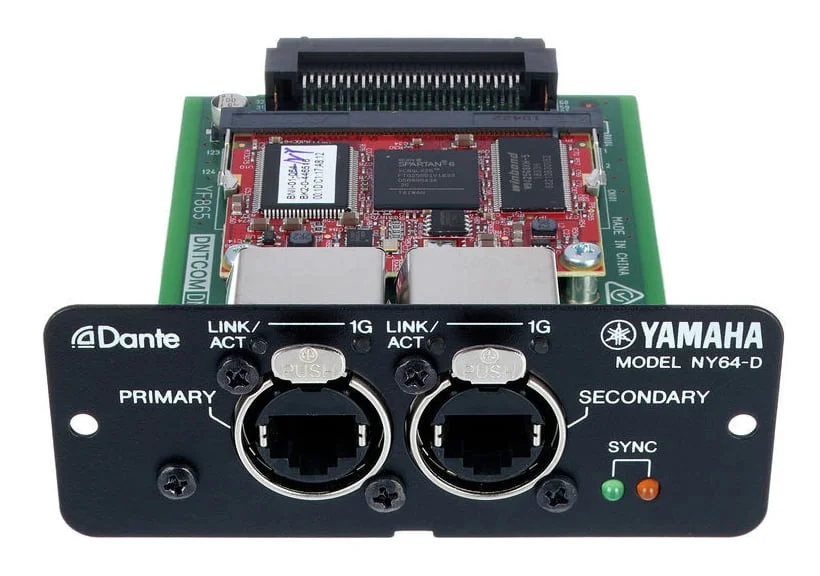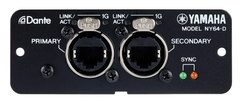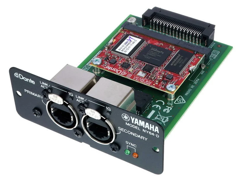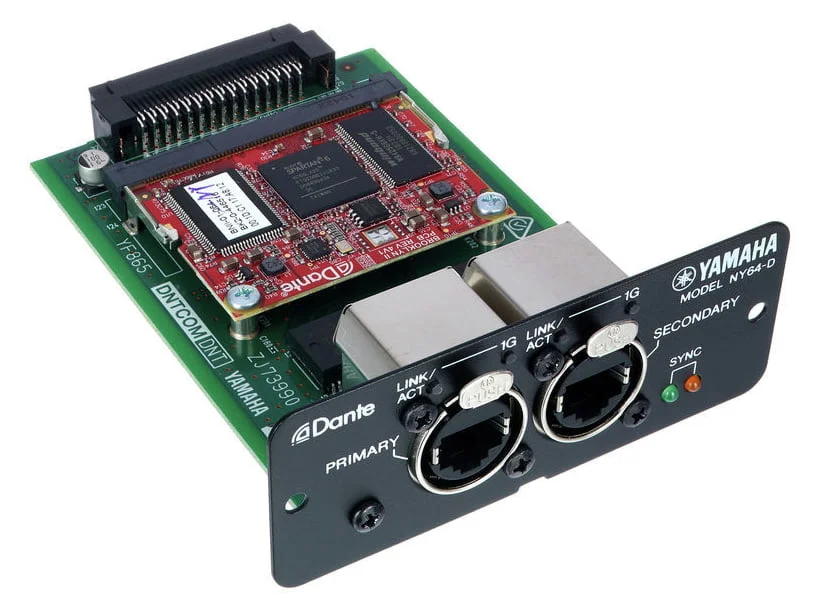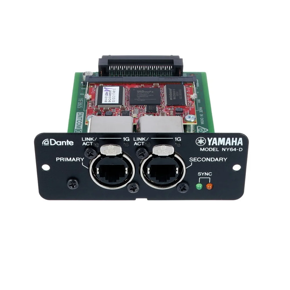 YAMAHA NY64-D представляет собой опциональную карту расширения входов/выходов для консолей Yamaha линейки TF. Карта дает возможность не только принимать, но и передавать сигнал на 128 каналов, это 64 входа и 64 выхода. Аудиосигнал передается без сжатия, частота дискретизации 48 кГц/32 бит. Устройство работает посредством сетей Dante. Примечание производителя: карта расширения YAMAHA NY64-D совместима только с цифровыми консолями Yamaha серии TF. Карта Dante-Интерфейс для пультов серии TF.