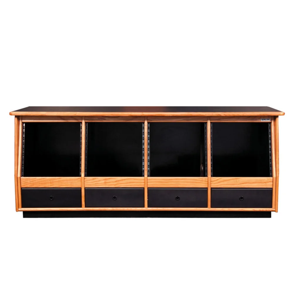 Профессиональный студийный стеллаж из высококачественной березовой фанеры и массива дерева (ясень). Боковые панели из массива дерева действительно создают ощущение высокого качества и долговечности. Нижняя часть стеллажей обычно предназначена для менее используемого оборудования, так как вам приходится довольно сильно наклоняться, поэтому в Zaor предпочли использовать ее в качестве практичного выдвижного ящика.