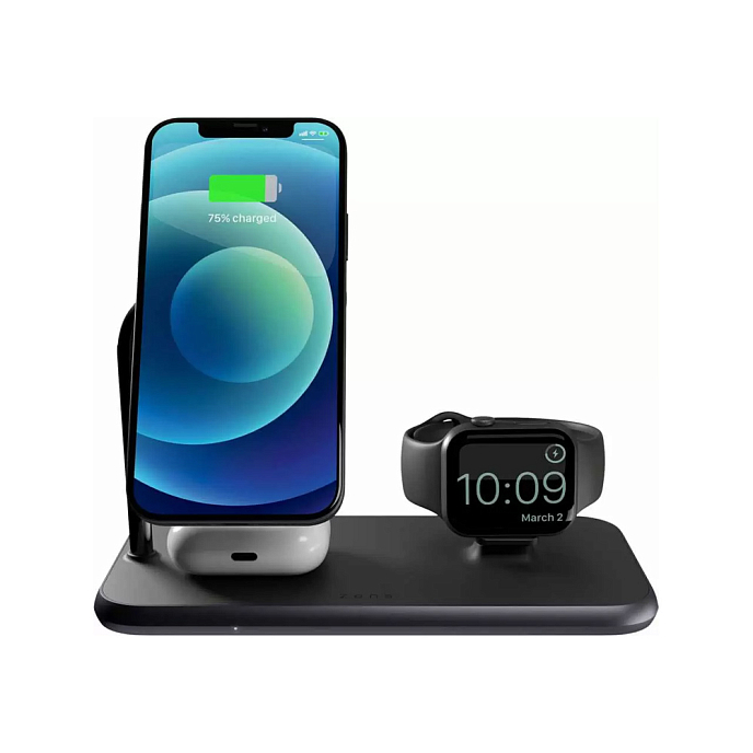 ZENS Wireless Charger MagSafe позволяет одновременно заряжать iPhone, AirPods и Apple Watch. Магнитный держатель удерживает ваш MagSafe-совместимый iPhone на месте во время зарядки. На левой стороне зарядной панели находится зона беспроводной зарядки, в которой вы можете заряжать свои AirPods или другие устройства Qi. На правой стороне зарядной панели есть встроенный вертикальный порт USB-A.