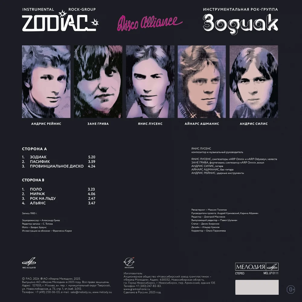 Пластинка, переизданная в 2025 году с матриц, изготовленных по оригинальным мастер-лентам, звучит свежо и объемно, словно специально создана для сегодняшних клубных систем. Реставрация и ремастеринг от Максима Пилипова бережно раскрывают каждую ноту, подчёркивая футуристический шарм альбома. В издание также вошла оригинальная аннотация музыкального критика Дениса Бояринова - важный штрих, возвращающий слушателя к эпохе появления этого невероятного проекта. В своё время “Disco Alliance” стал настоящим откровением: от гипнотических мелодий до почти мультипликационных ритмов - Zodiac зародили в советской музыке собственную галактику, которая спустя десятилетия продолжает притягивать новых слушателей и вдохновлять современных электронных продюсеров.