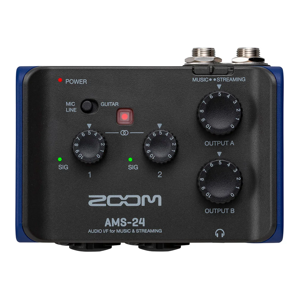 Zoom AMS-24 — портативный 2-канальный USB-аудиоинтерфейс для записи музыки и стриминга живых выступлений. Устройство обеспечивает частоту дискретизации 24 бит / 96 кГц и поддерживает работу с компьютерами и мобильными устройствами на операционных системах Windows, macOS, iOS и Android.