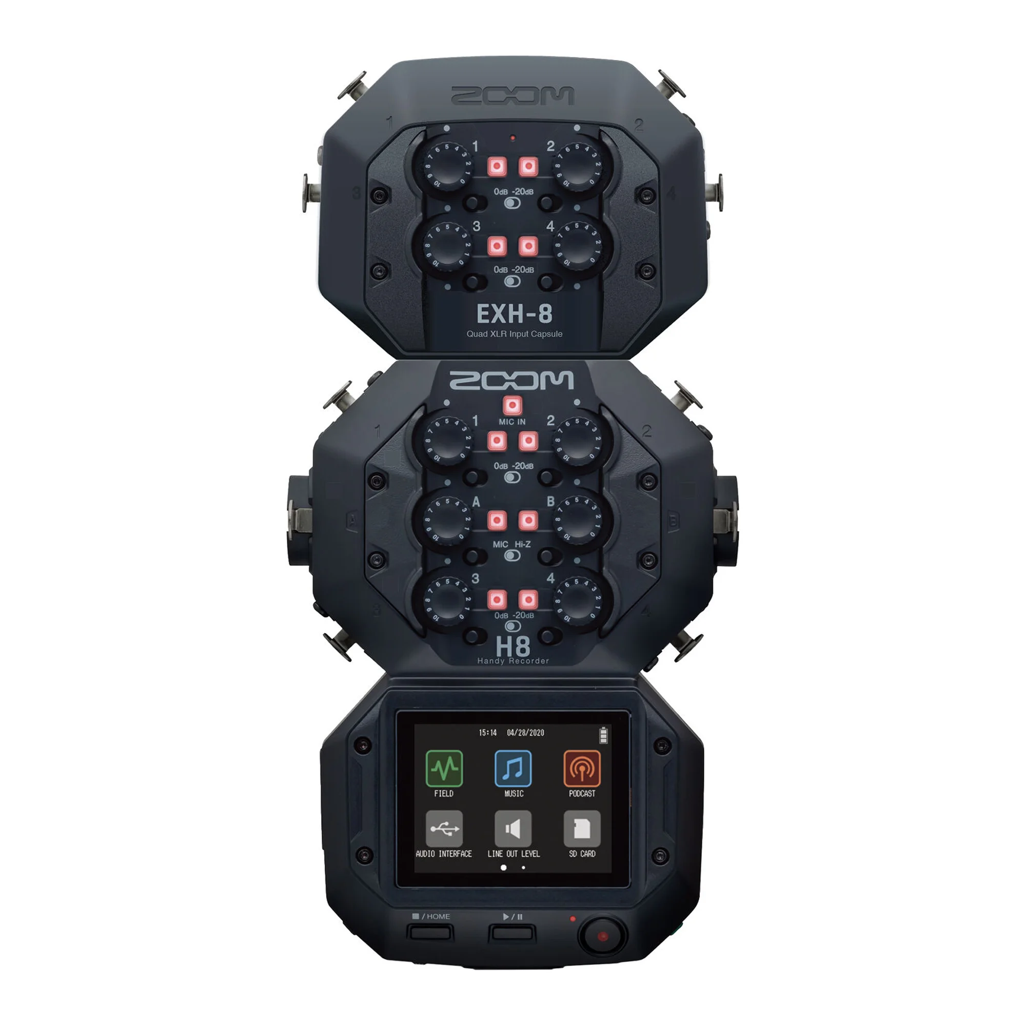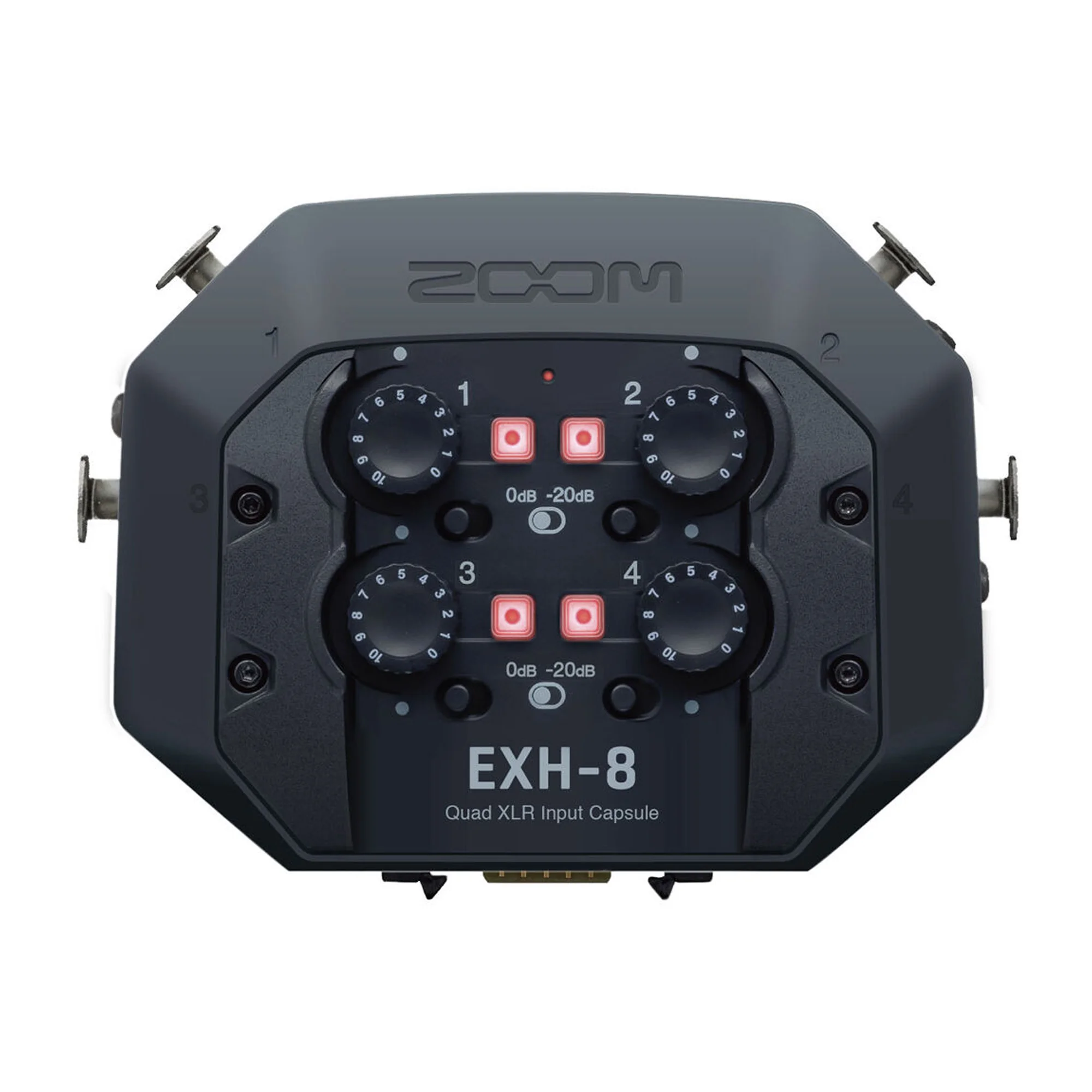 Zoom EXH-8 – сменный модуль, который добавляет 4 дополнительных XLR-входа вашему аудиорекордеру Zoom с поддержкой системы сменных капсюлей второго поколения (Capsule System 2.0). С EXH-8 можно даже использовать конденсаторные микрофоны – модуль оснащен разъемом DC5V для подключения источника фантомного питания (microUSB).