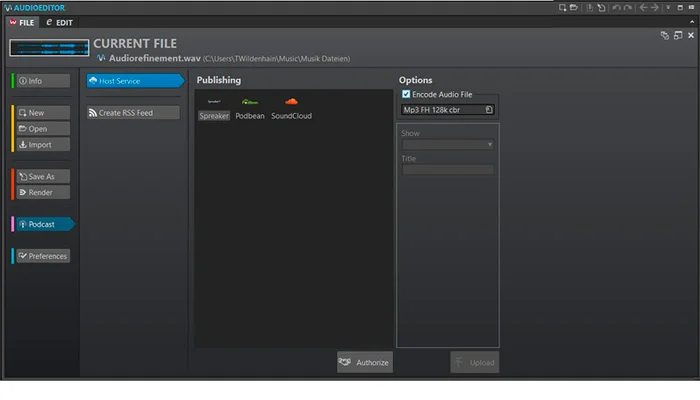 WaveLab Cast позволяет напрямую соединяться с такими каталогами подкастов, как Spreaker или Podbean. Вы можете быстро загружать свои подкасты, а также напрямую создавать и публиковать RSS-каналы.